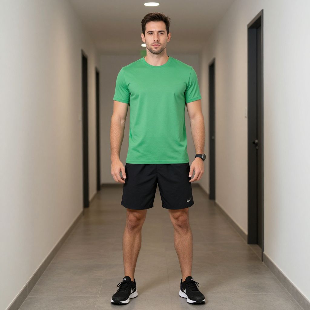 Workout Attire Costume, man in a green shirt standing in a hallway