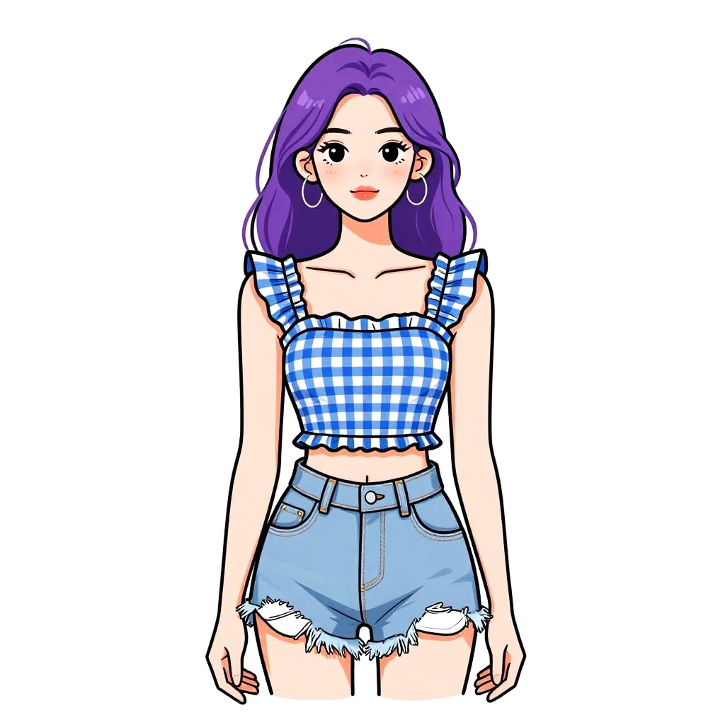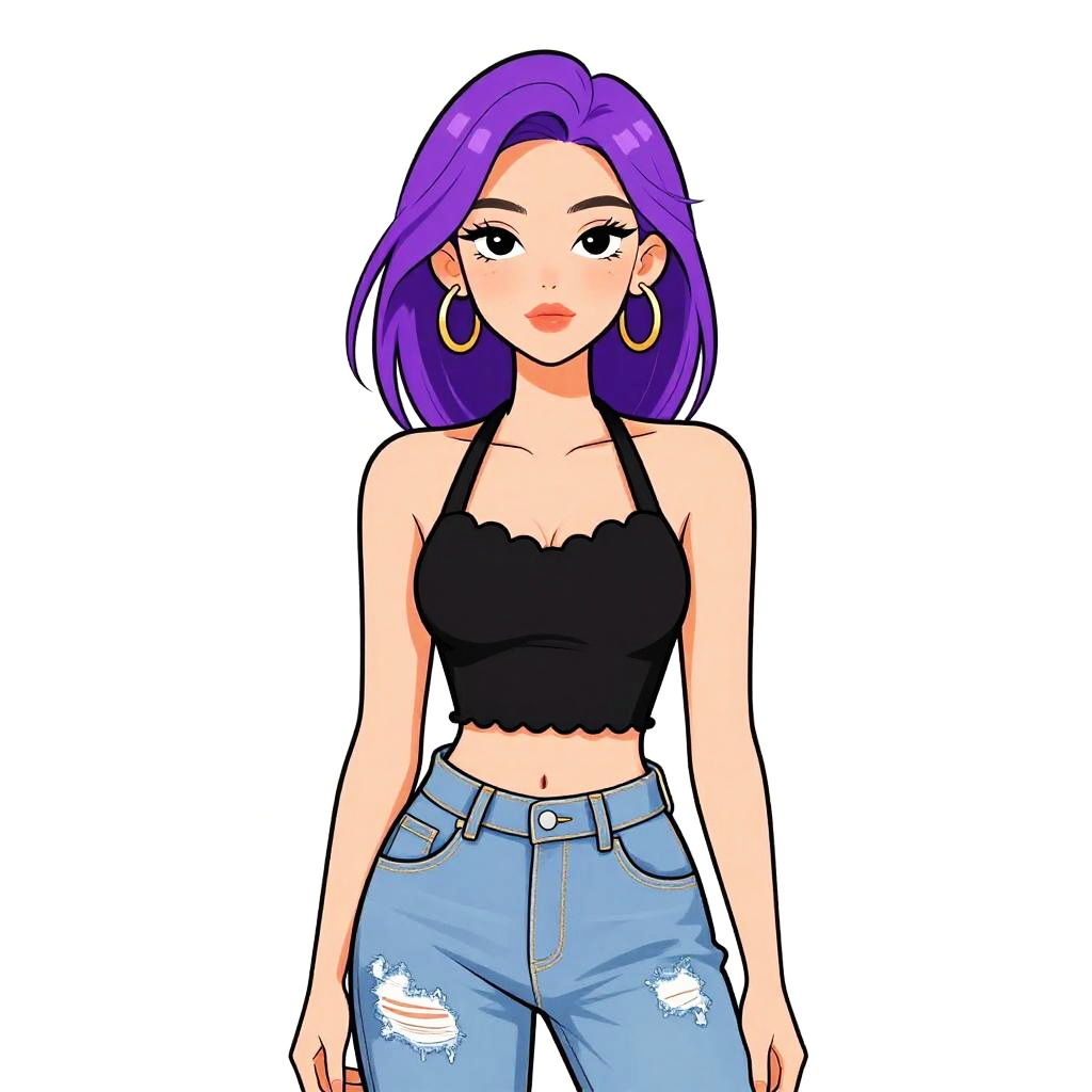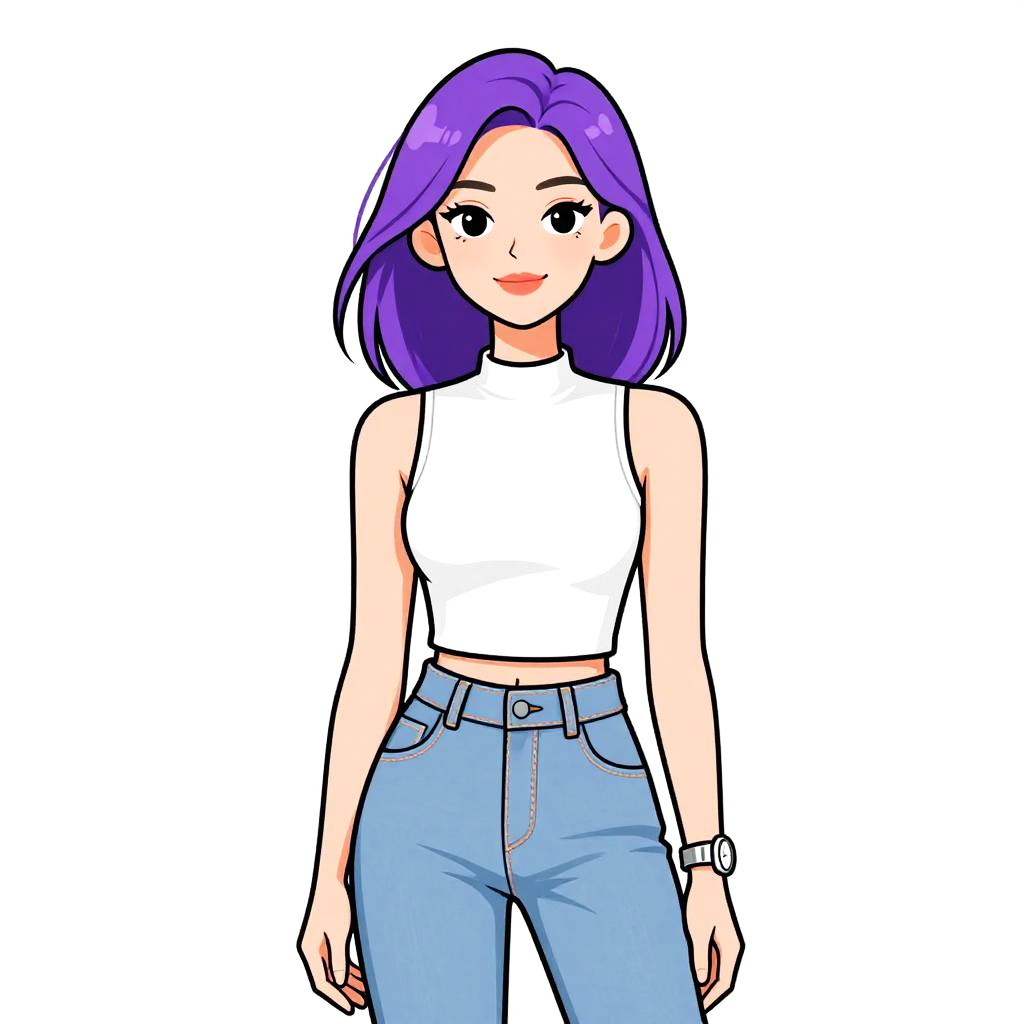 Woman with pretty face and pretty hair. Woman, modern casual, sleeveless high neck crop top in white with horizontal black stripes, form-fitting, high-waist skinny denim jeans with button closure, plain white background. --sref 1467