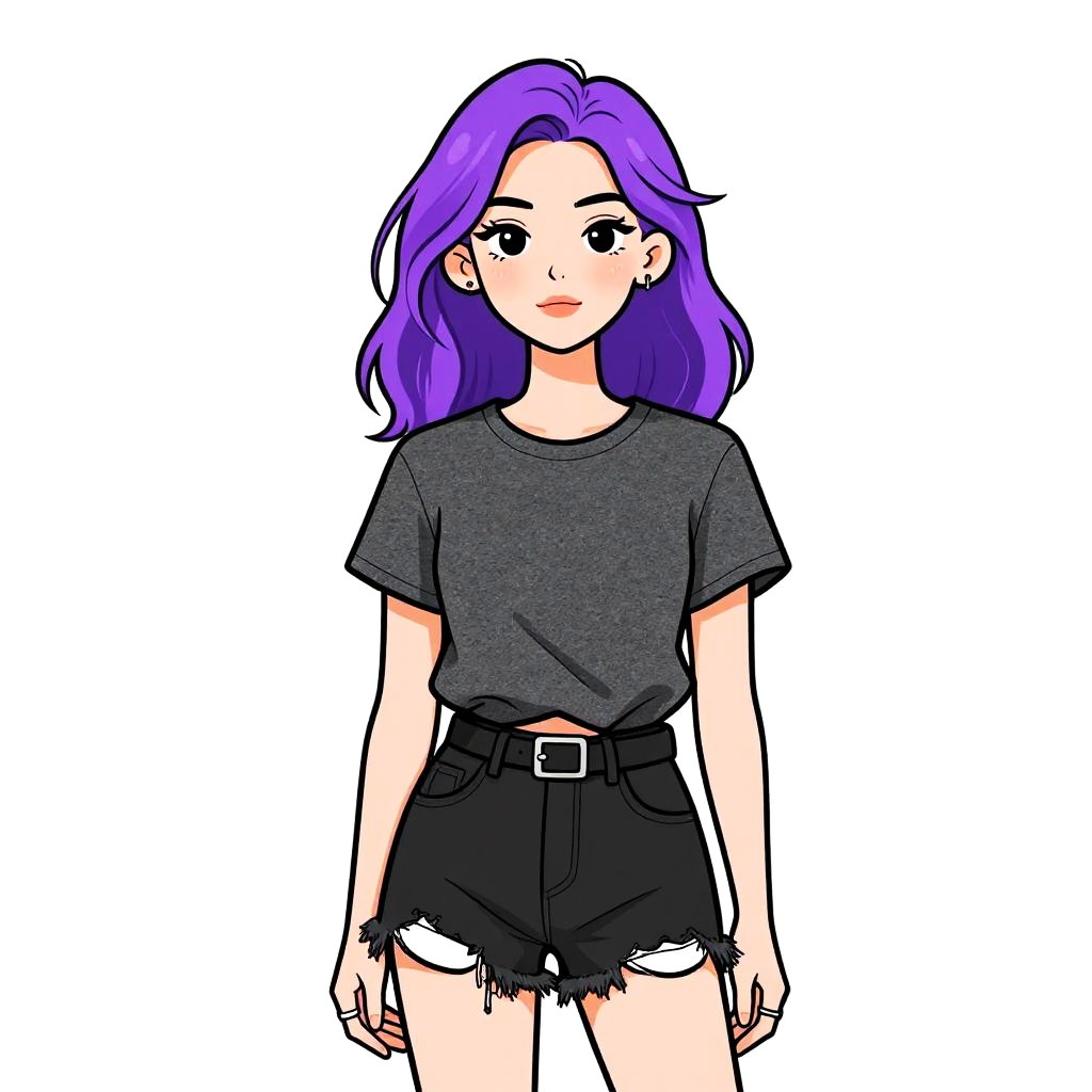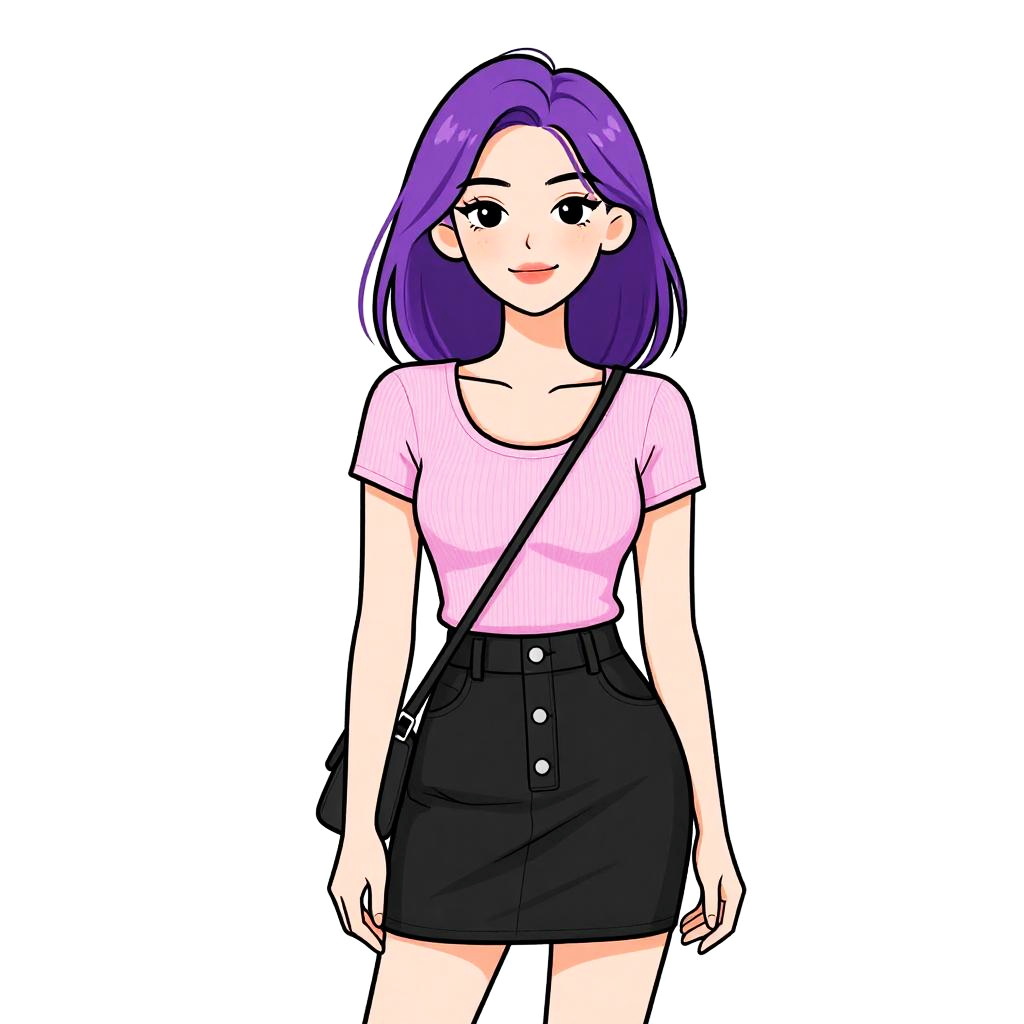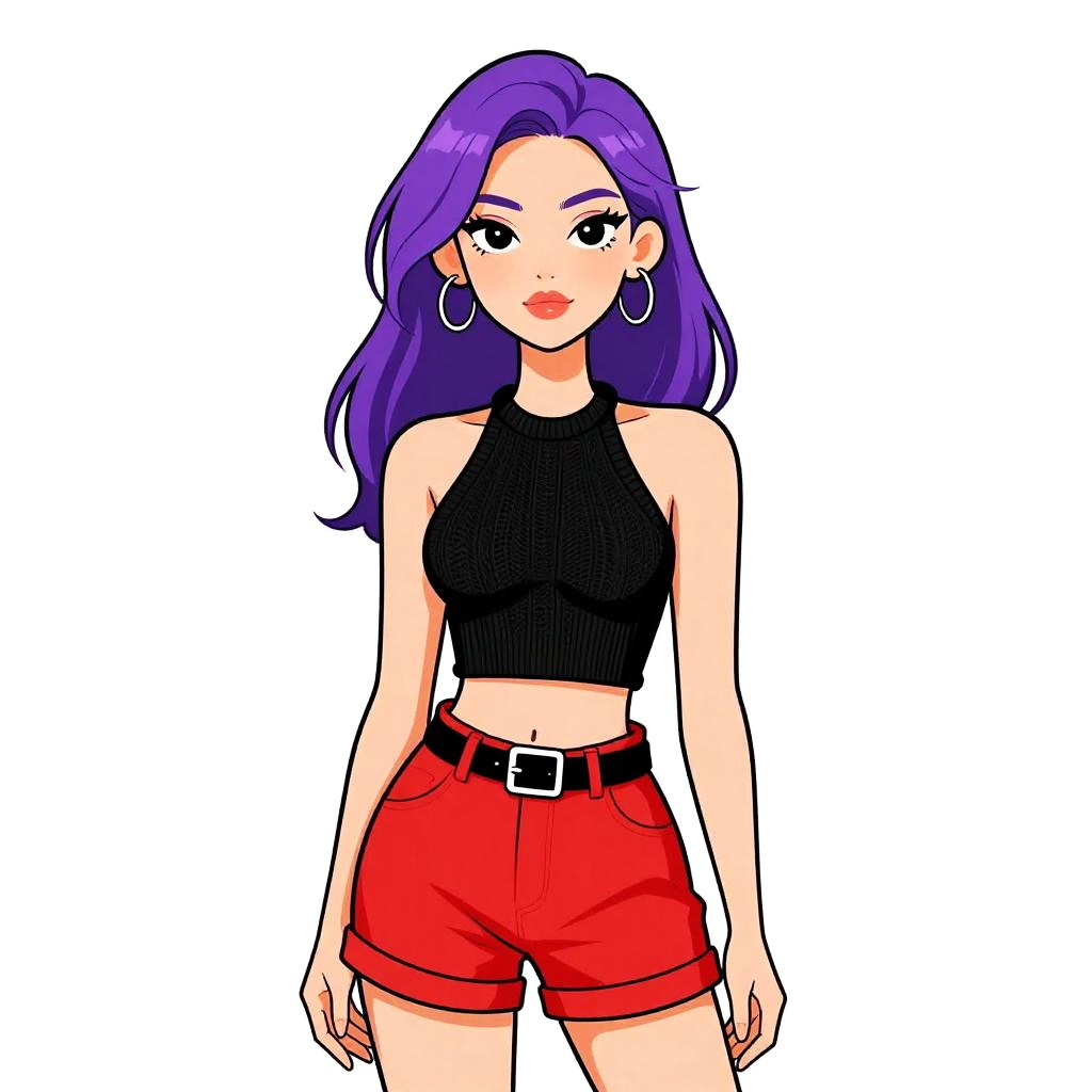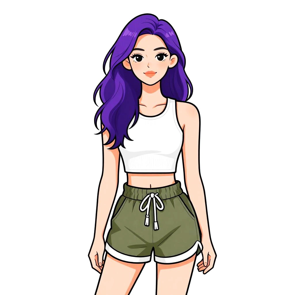 Woman with pretty face and pretty hair. Woman, modern casual, sleeveless high neck crop top in white with horizontal black stripes, form-fitting, high-waist skinny denim jeans with button closure, plain white background. --sref 1467