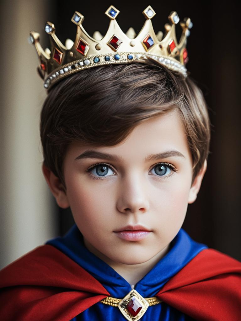 Close-up portrait of a young boy with blue eyes and short brown hair wearing a detailed gold crown adorned with multicolored jewels and a red cape over a blue outfit. The boy is looking directly at the camera against a softly blurred background.
