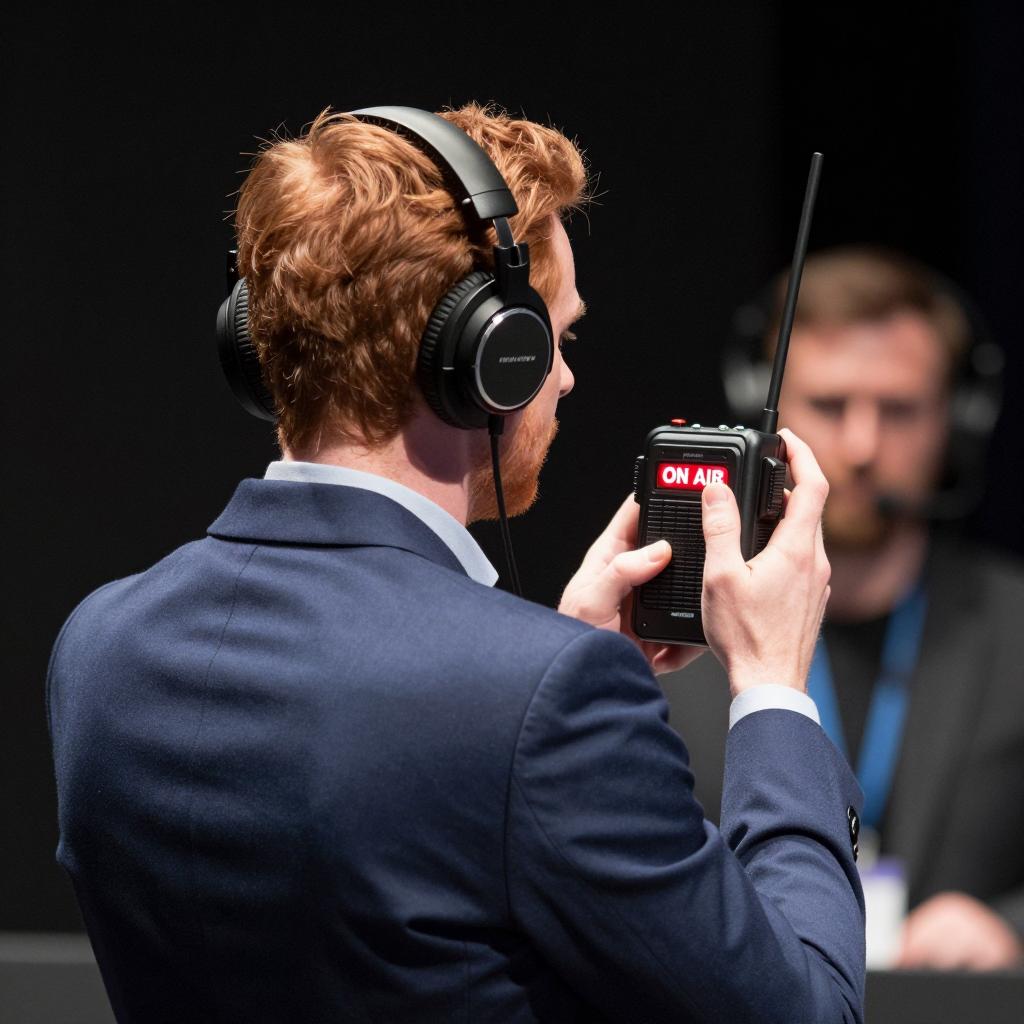 Red-haired man in a blue suit jacket and white shirt wearing black over-ear headphones, holding a black radio device with a red 'ON AIR' indicator light. A blurred person is visible in the dimly lit background.