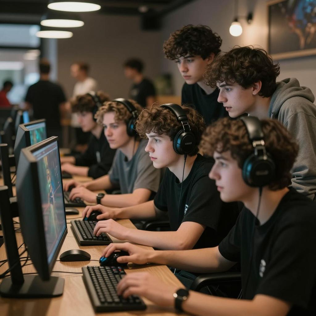 Man with red-brown hair, wearing black headphones, blue suit jacket, white shirt, facing away, holding black radio equipment labeled "ON AIR" with red lights, dark background, dim lighting, one other person blurred in the background.