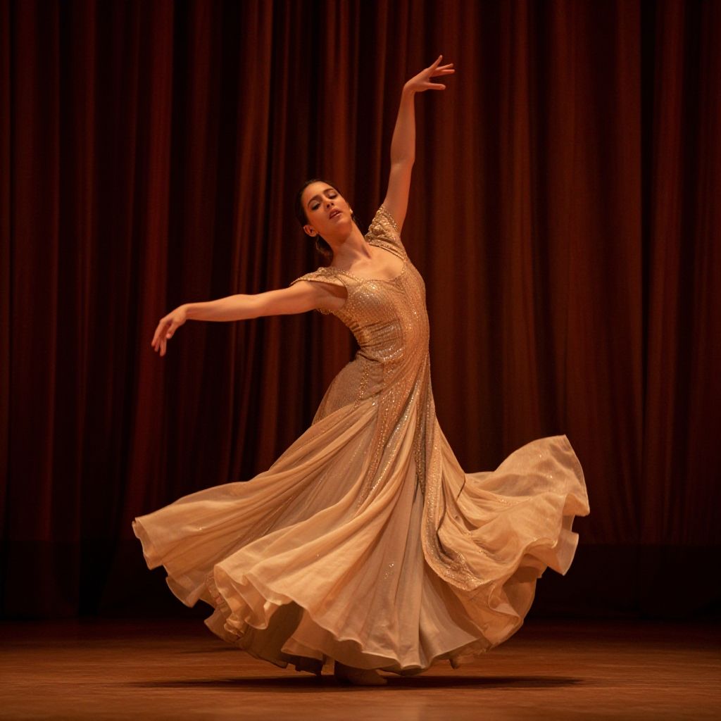 Tinaka depicted as a graceful dancer performing in a grand theater, elegant flowing garments with shimmering fabrics, soft spotlights highlighting expressive movements, lush velvety curtains in the background, warm color palette evoking emotion and drama.