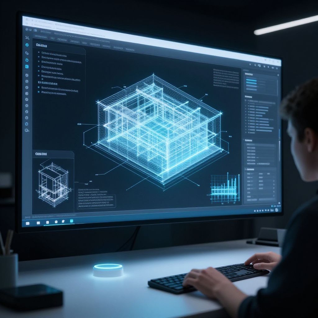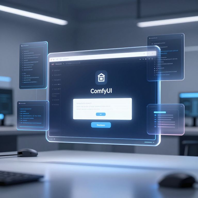 ComfyUI install screen displayed on a sleek transparent touchscreen, surrounded by floating UI elements and command lines, ambient lighting in a minimalist tech lab, cyberpunk aesthetics, crisp and clean design