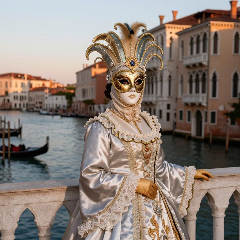 Photograph of a person in an elaborate Venetian masquerade costume standing on a white stone bridge. The individual wears a silver, satin gown with intricate lace trim, and a gold and silver headdress adorned with feathers. Their face is covered by a black and gold masquerade mask with elaborate eye details. The background features a canal with gondolas and pastel-colored buildings bathed in warm, late-afternoon sunlight. The bridge's balustrade is visible in the foreground, adding depth to the scene. The overall image evokes a sense of opulence and historical elegance.