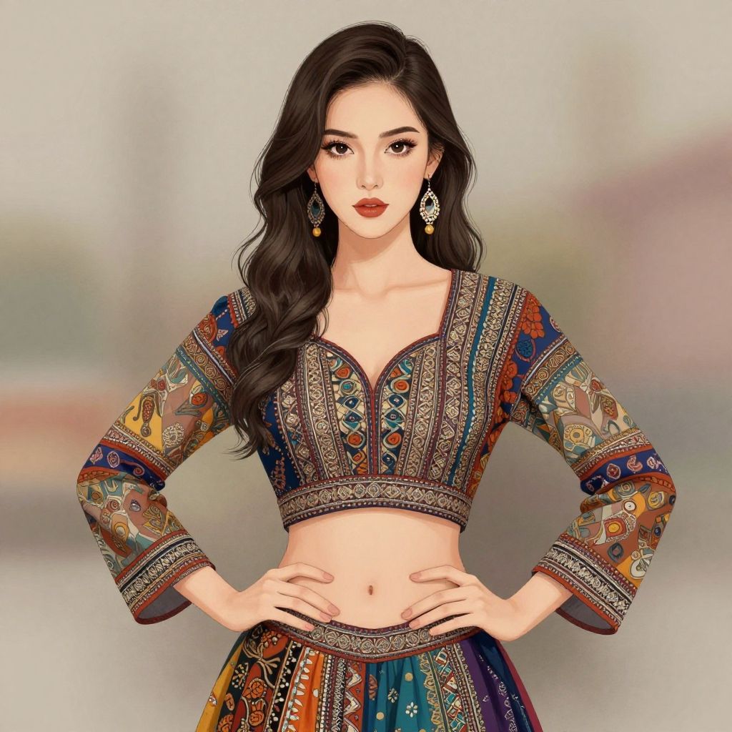 Digital illustration of an Asian woman with long black hair, wearing a colorful, embroidered crop top and skirt, standing with hands on hips, set against a