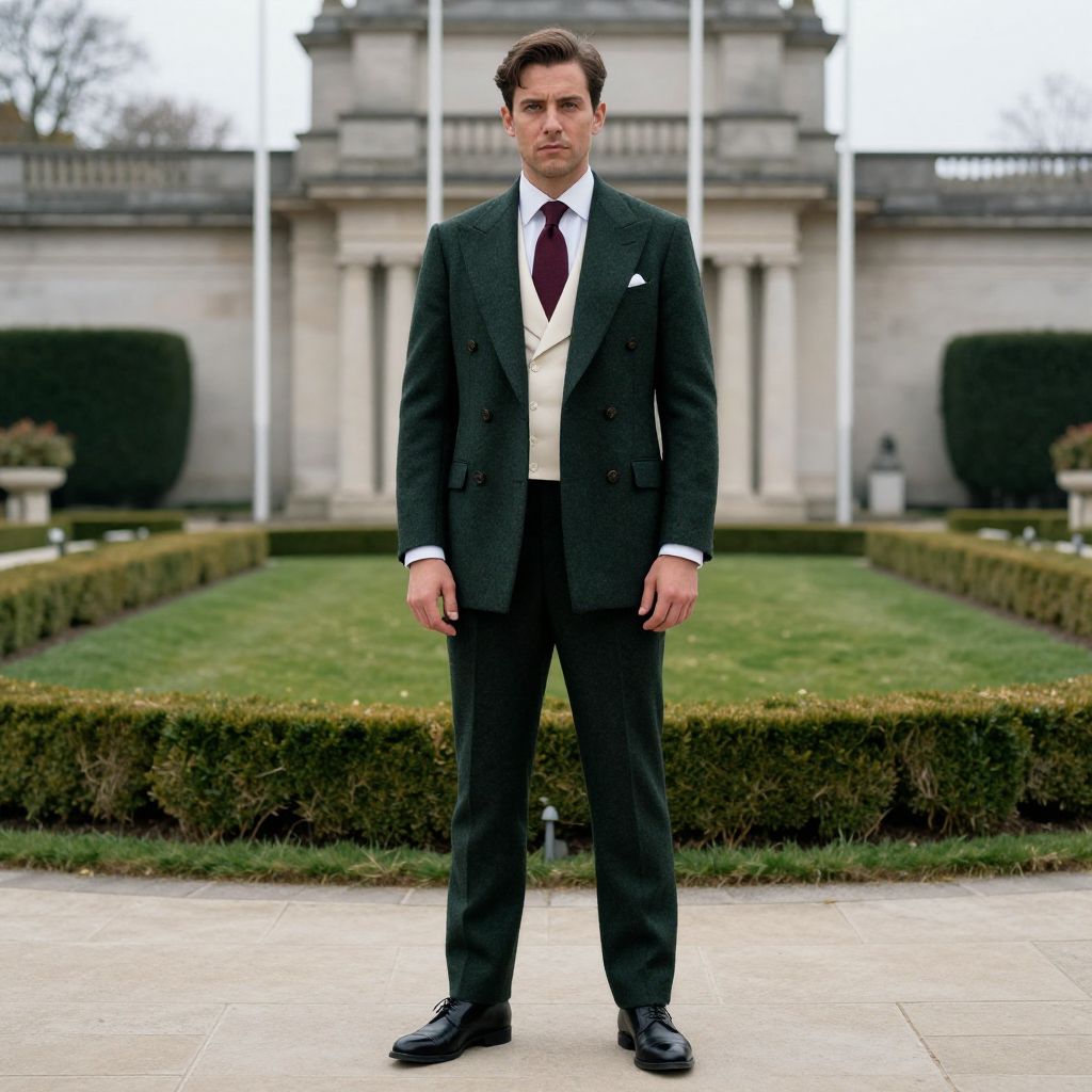 Photograph of a Caucasian man standing in a formal garden. He has short, dark brown hair and is wearing a dark green tweed suit with a white shirt, maroon tie, and cream waistcoat. His black dress shoes are polished. He stands with a serious expression, hands by his sides. The background shows a manicured lawn, trimmed hedges, and a classical stone building with tall columns and vertical flags. The sky is overcast, and the garden is symmetrically arranged. The overall style is formal and elegant.