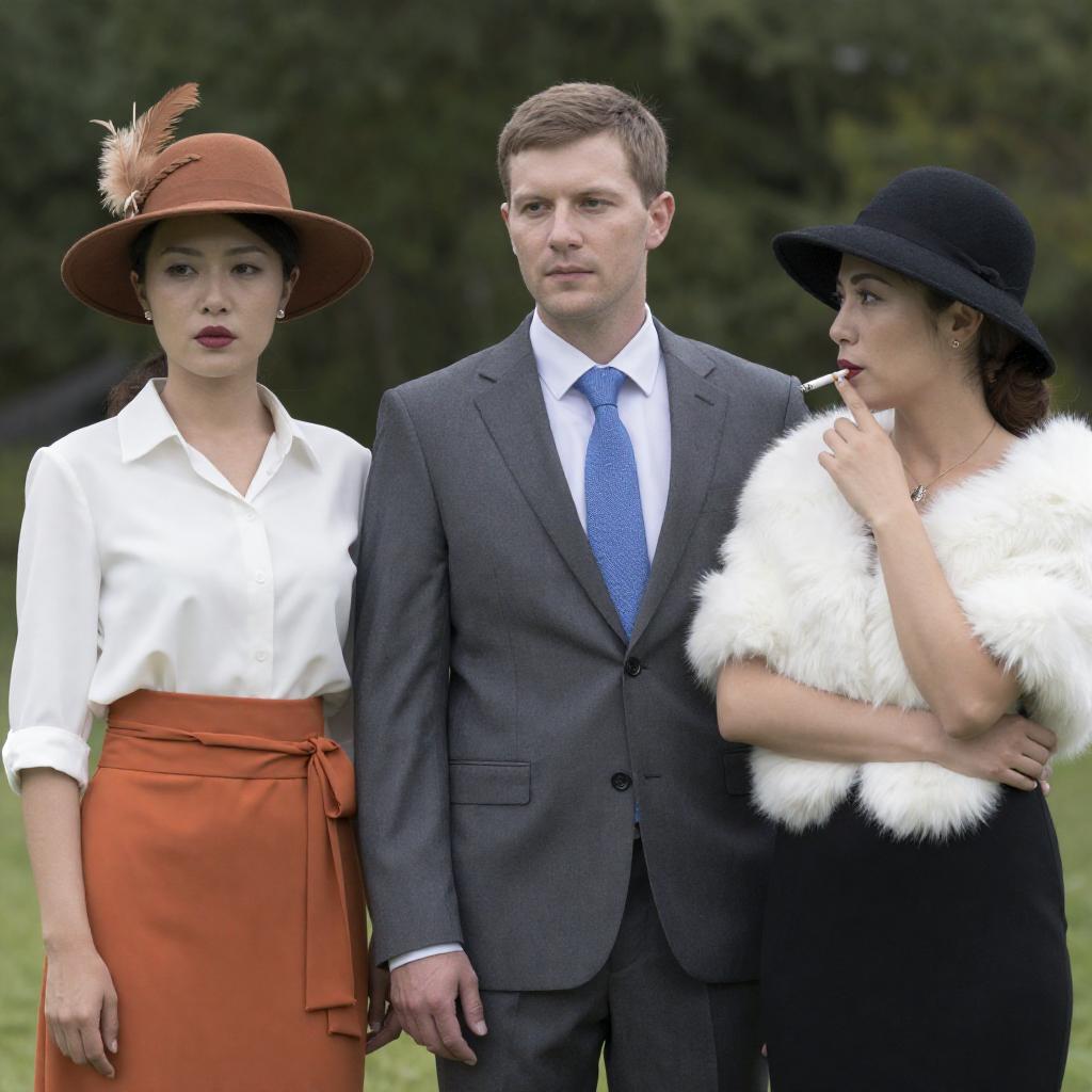 Photograph of three people in a vintage car. A woman with red lipstick and a white hat with a red feather leans on the car's left. A man in a brown hat and green tweed coat sits in the middle, smiling. A man in a dark blue suit and brown hat stands on the right, smiling. Green trees in the background.