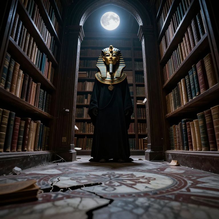 A cryptic ritual unfolds in an abandoned library teeming with bound volumes of forgotten knowledge as an enigmatic figure stands at the threshold between reality and the supernatural. Adorned in an intricate mask reminiscent of an ancient Egyptian pharaoh, this mysterious being is illuminated by a celestial event that casts otherworldly light upon their surroundings. From a 'bug's eye' perspective beneath ornate marble flooring, the viewer peers through cracks to witness this cryptic scene, filled with awe and curiosity as towering shelves hold secrets waiting to be unlocked. The dramatic chiaroscuro lighting enhances tension between darkness and enlightenment, creating a visual masterpiece that entwines historical mystique with an air of enigma.