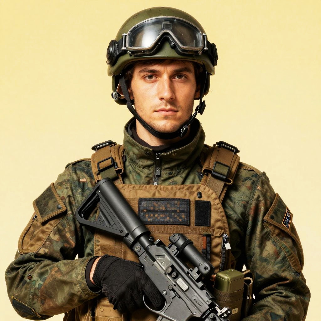 Close-up portrait of a young male soldier wearing a green tactical helmet with goggles, camouflage uniform, and tan bulletproof vest. He holds a black assault rifle with both hands. The image features detailed military equipment and a neutral yellow background.