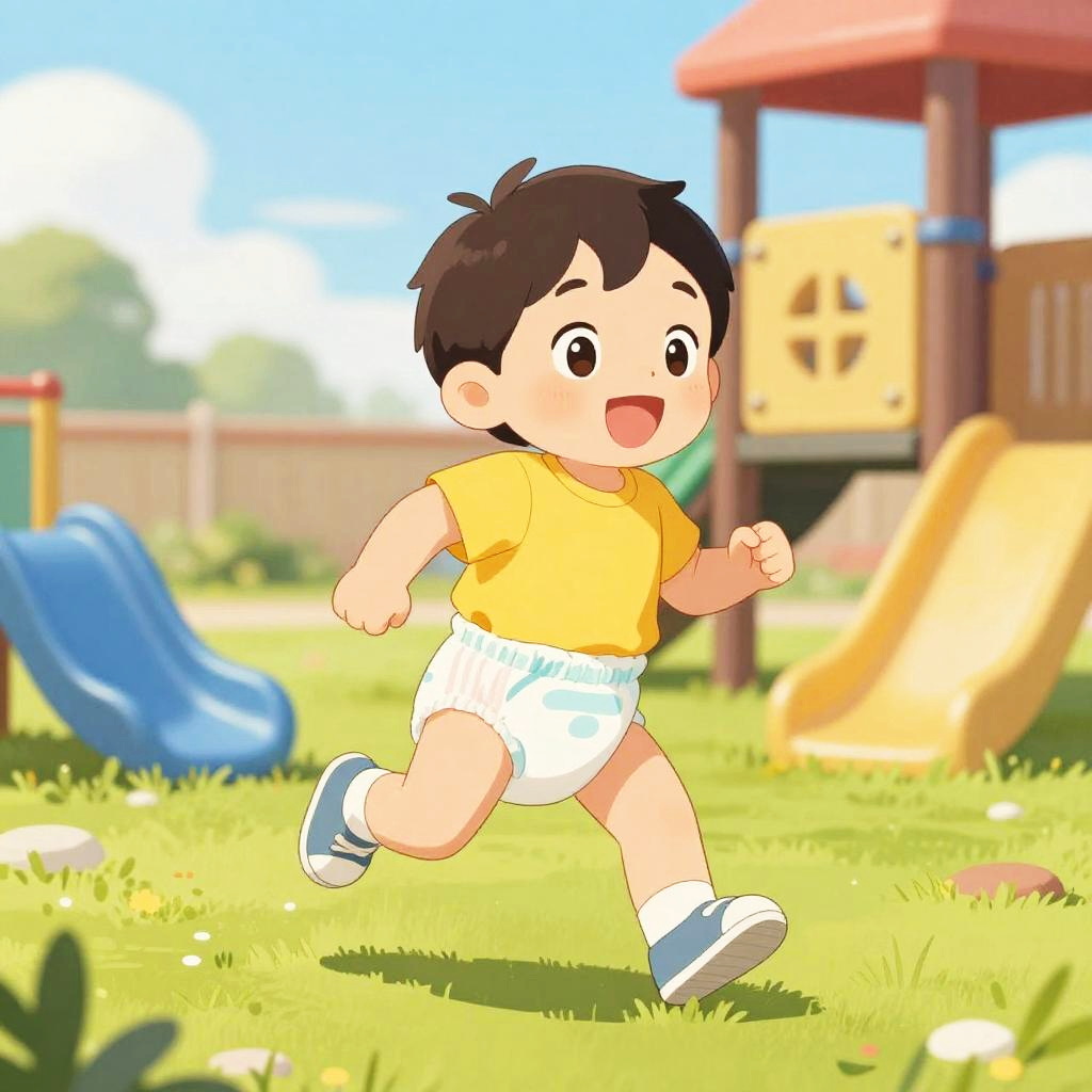 Kindergarten saggy diaper, little kid running in playground, exaggerated sagging diaper with toddler clothes, sunny day with blue sky and green grass, expressive joyful face, high detail illustration