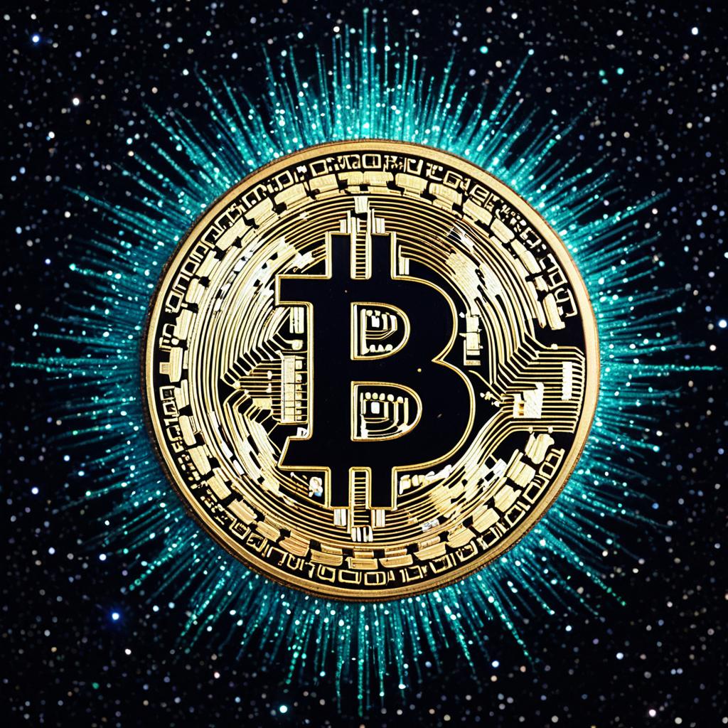 Artistic representation of the Bitcoin logo depicted as a cosmic entity, composed of iridescent cosmic filaments and surrounded by sparkling neutron stars and glimmering auroras, set against an ethereal starfield background.
