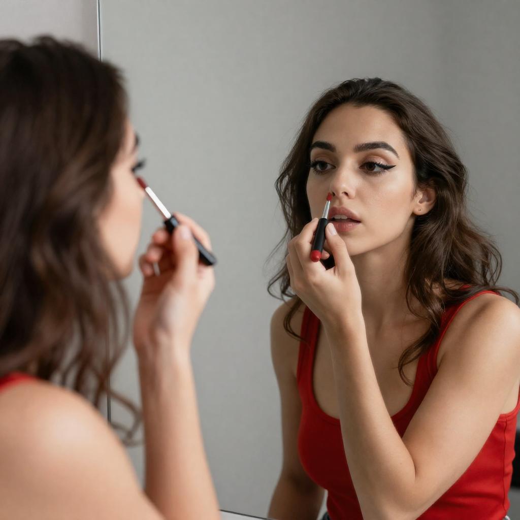 Photograph of a woman with wavy dark brown hair, wearing a red sleeveless top, applying black eyeliner with a red-tipped eyeliner brush in front of a mirror. Her reflection shows focused eyes and slightly parted lips. The background is a plain, gray wall.