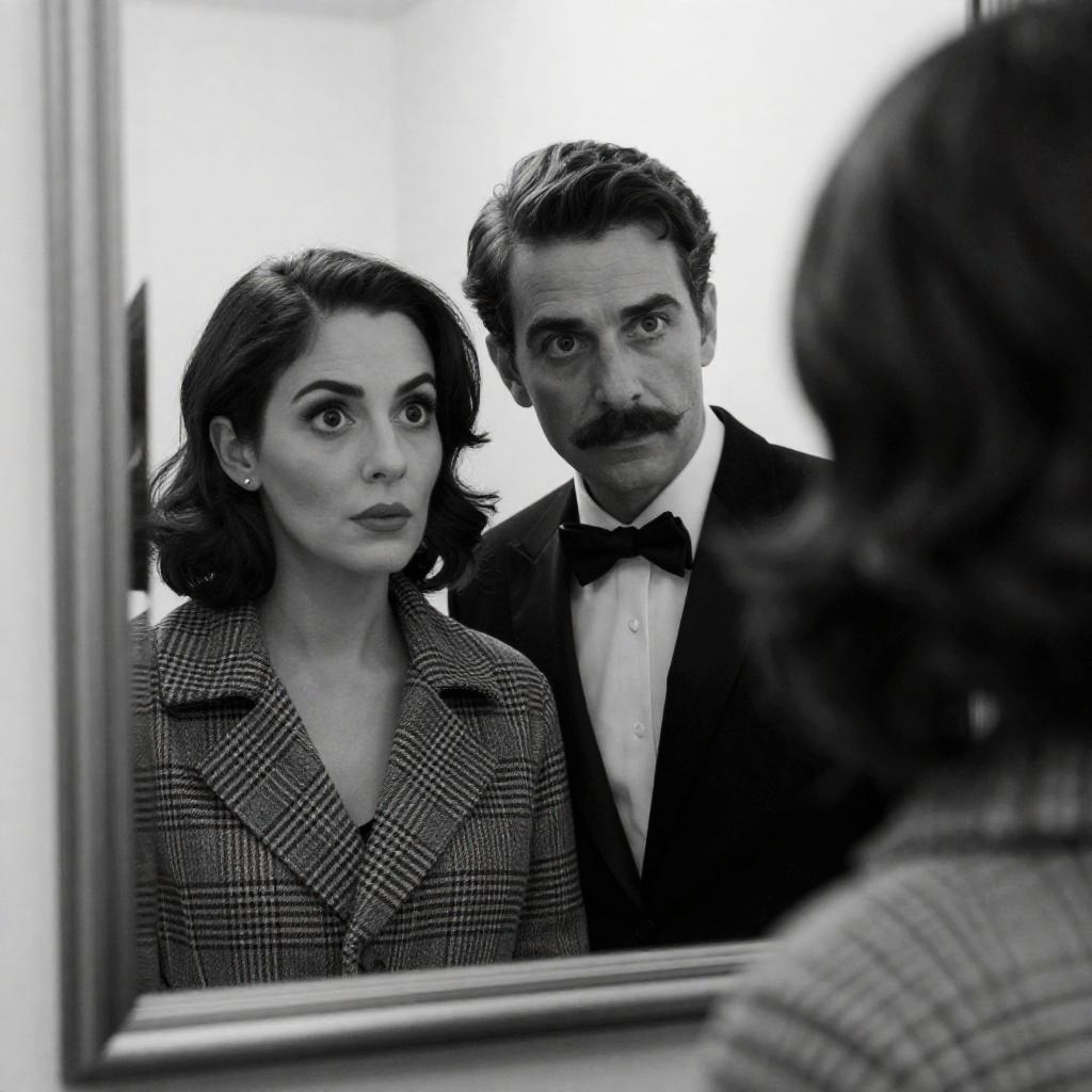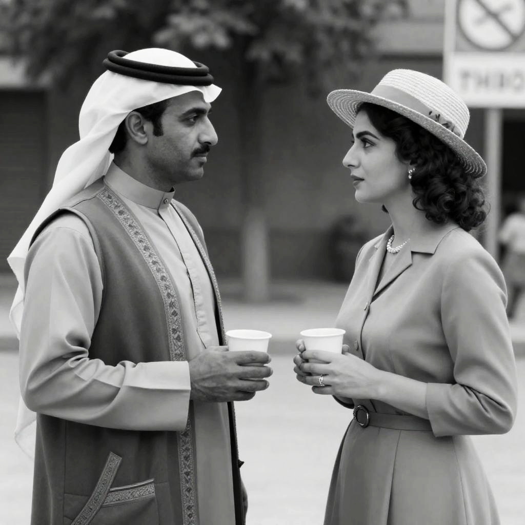 Black-and-white photograph of a man and woman outdoors. Man wears traditional Middle Eastern attire with a headscarf, patterned vest. Woman in 1940s-style dress, straw hat, holding a cup. They stand close, facing each other. Background includes trees and blurred signs. Man's expression is serious, woman's expression is engaged. Both hold cups.