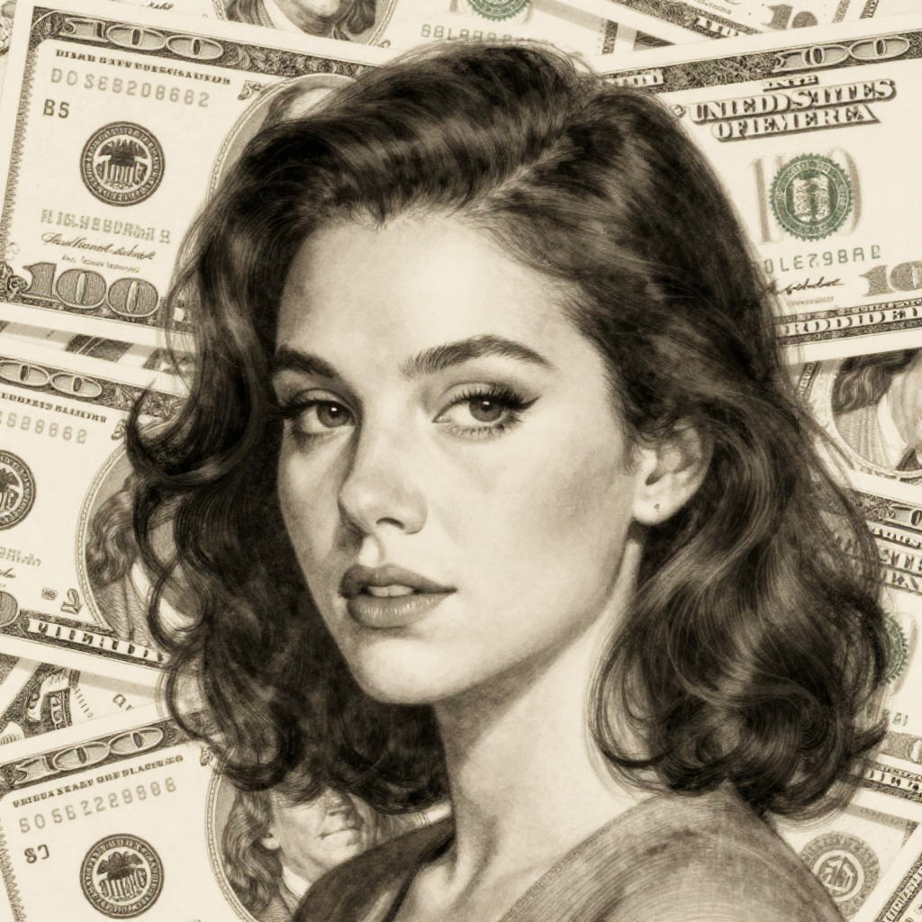 This image is a digital drawing in a grayscale, vintage style. It features a close-up of a woman's face with wavy, dark hair and subtle makeup, looking slightly to the side with a calm expression. She is surrounded by overlapping, intricately detailed money bills, creating a textured, layered background. The overall composition has a nostalgic, classic feel.