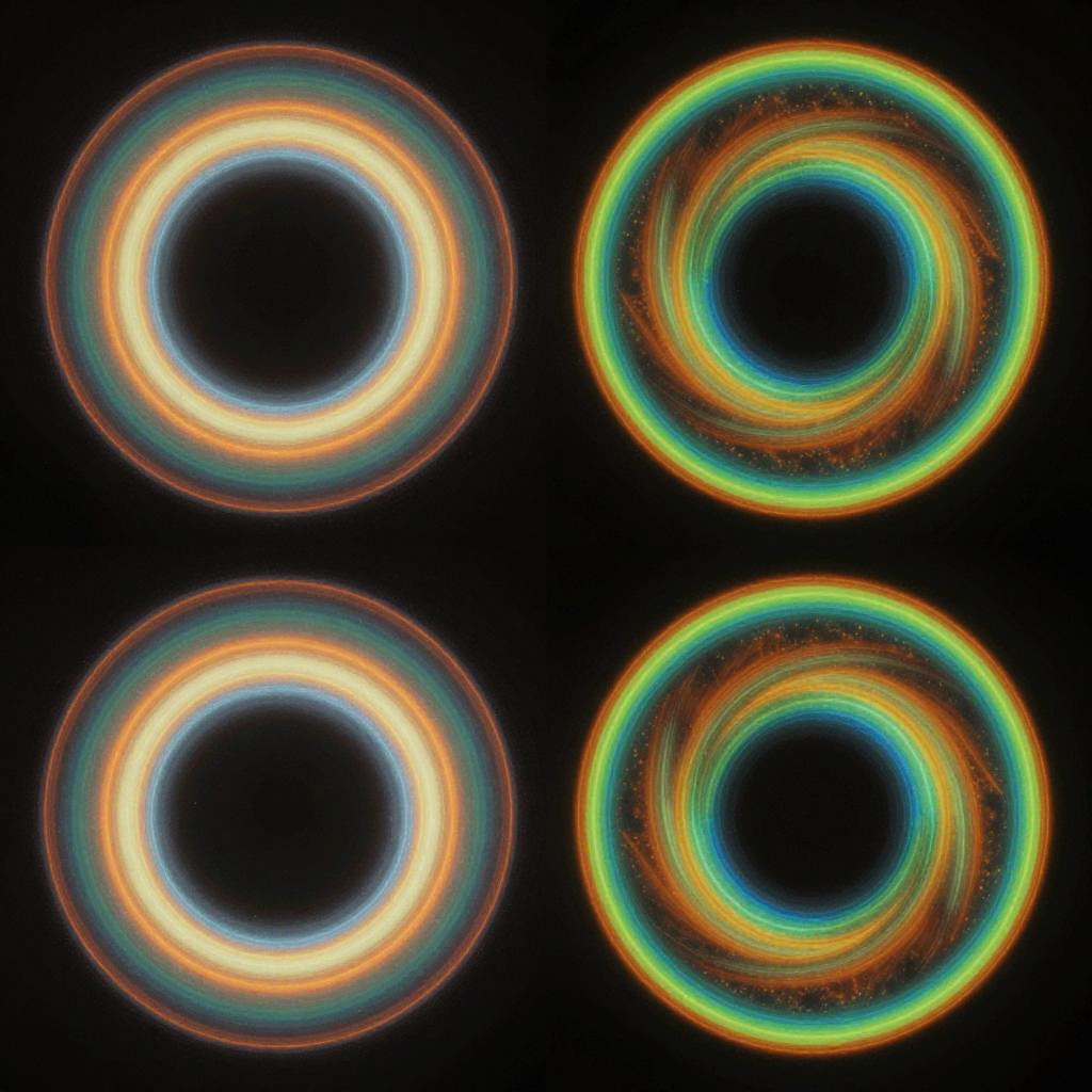 This is a photograph of four vibrant, circular light swirls against a dark background. Each swirl is a mix of colorful lights, including neon greens, blues, oranges, and yellows, creating a mesmerizing, almost cosmic effect. The lights are arranged in a grid pattern, with each swirl slightly overlapping the one beside it. The dark background makes the bright lights stand out, adding to the hypnotic visual impact.