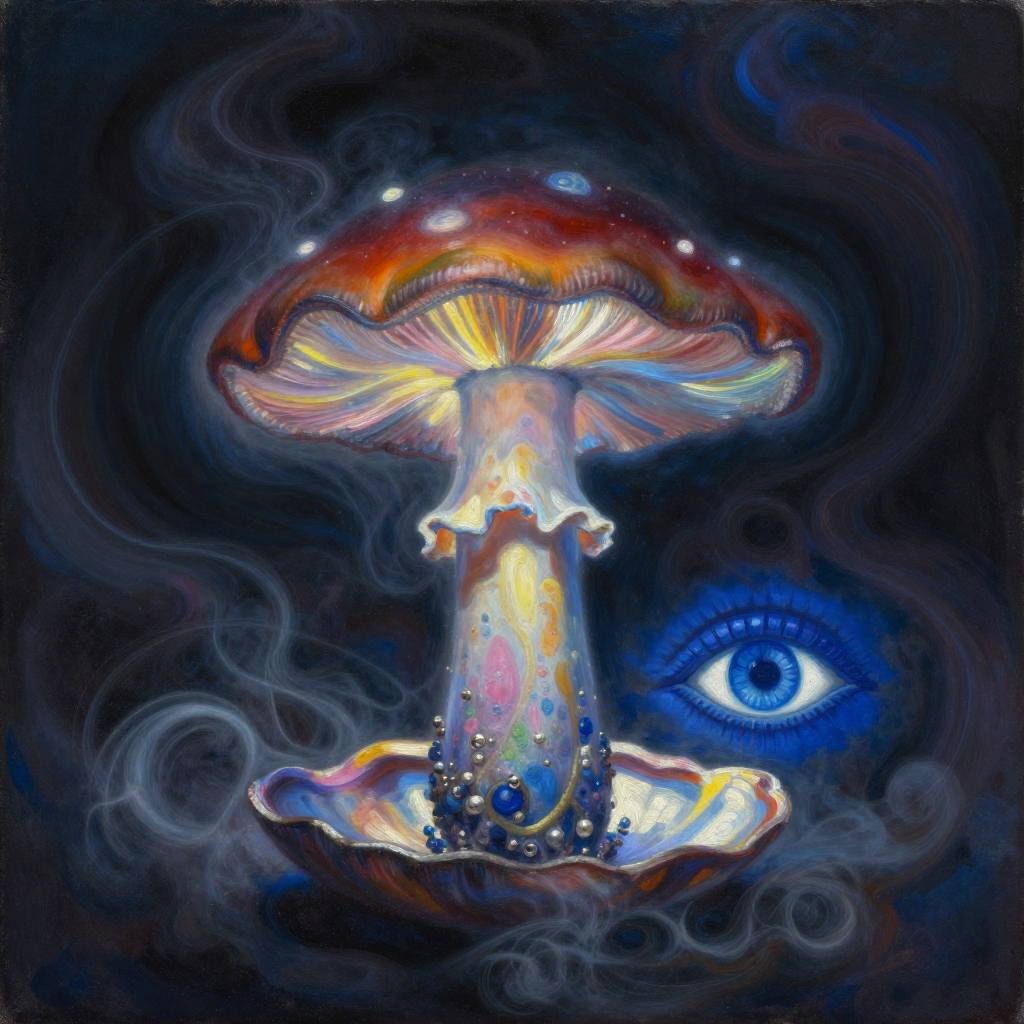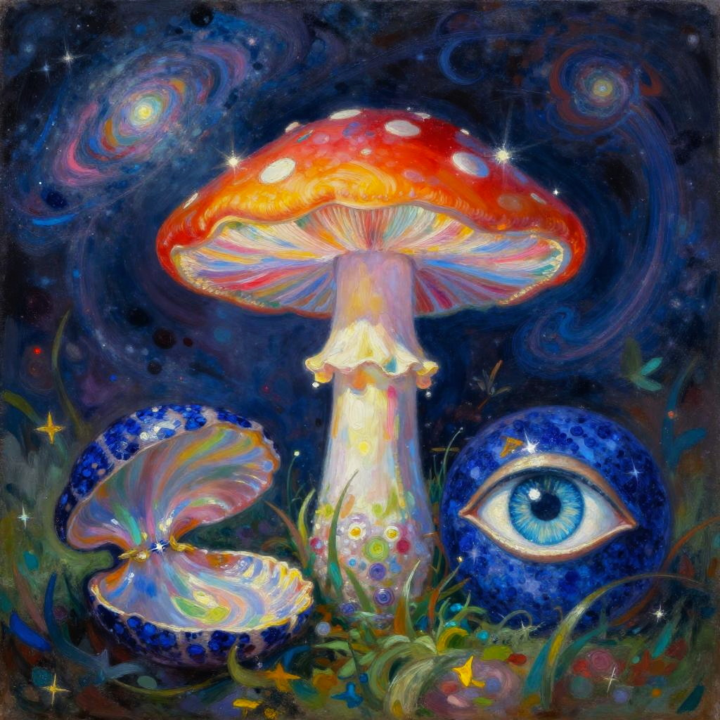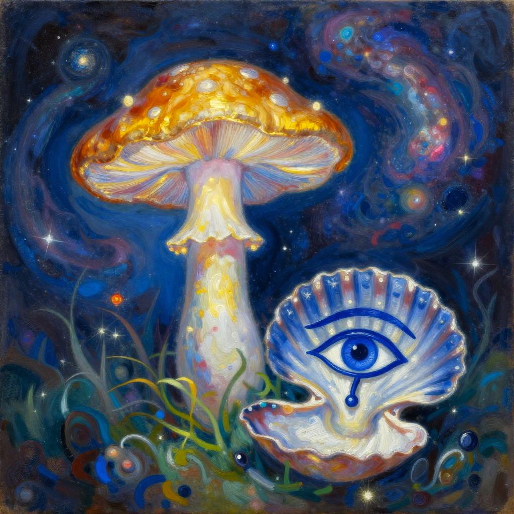 Oil painting inspired by Camille Pissarro, honoring Nuit with a mystical scene. Features a glowing iridescent mushroom, a soft ocean blue conch shell, and a deep sapphire Eye of Horus. Vibrant colors and a dreamy atmosphere with cosmic dust swirls, ethereal glow illuminating the mushroom, ultra-detailed, high quality, enchanting ambiance