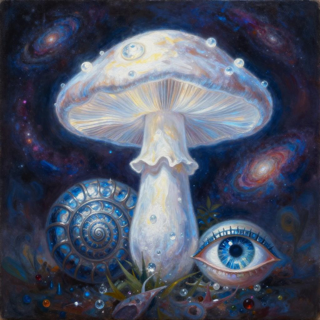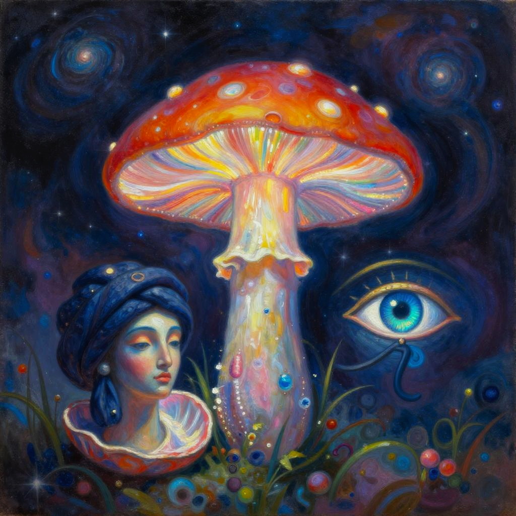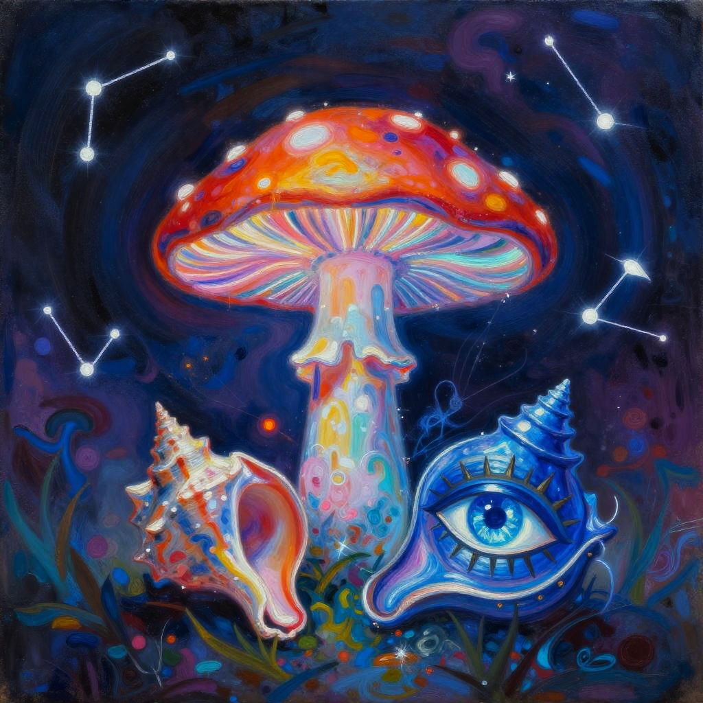 Oil painting inspired by Camille Pissarro, honoring Nuit with a mystical scene. Features a glowing iridescent mushroom, a soft ocean blue conch shell, and a deep sapphire Eye of Horus. Vibrant colors and a dreamy atmosphere with cosmic dust swirls, ethereal glow illuminating the mushroom, ultra-detailed, high quality, enchanting ambiance