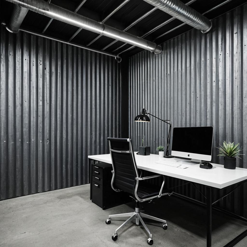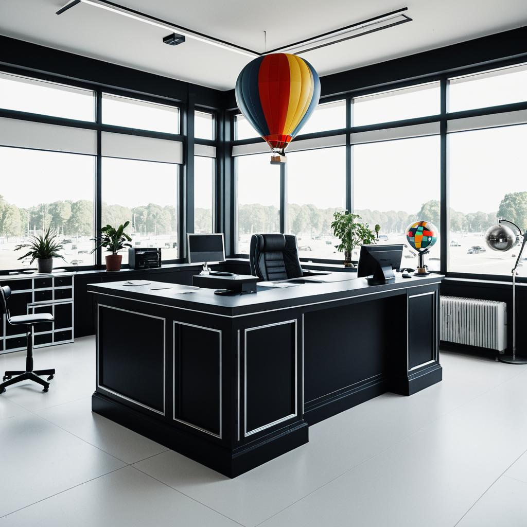 A sleek and spacious modern office interior featuring a large black executive desk with playing cards on top. The room is illuminated by natural light through expansive French windows, revealing a colorful hot air balloon outside. The office includes ergonomic chairs, indoor plants, a globe, and minimalistic decor inspired by Bauhaus and Dieter Rams design principles.