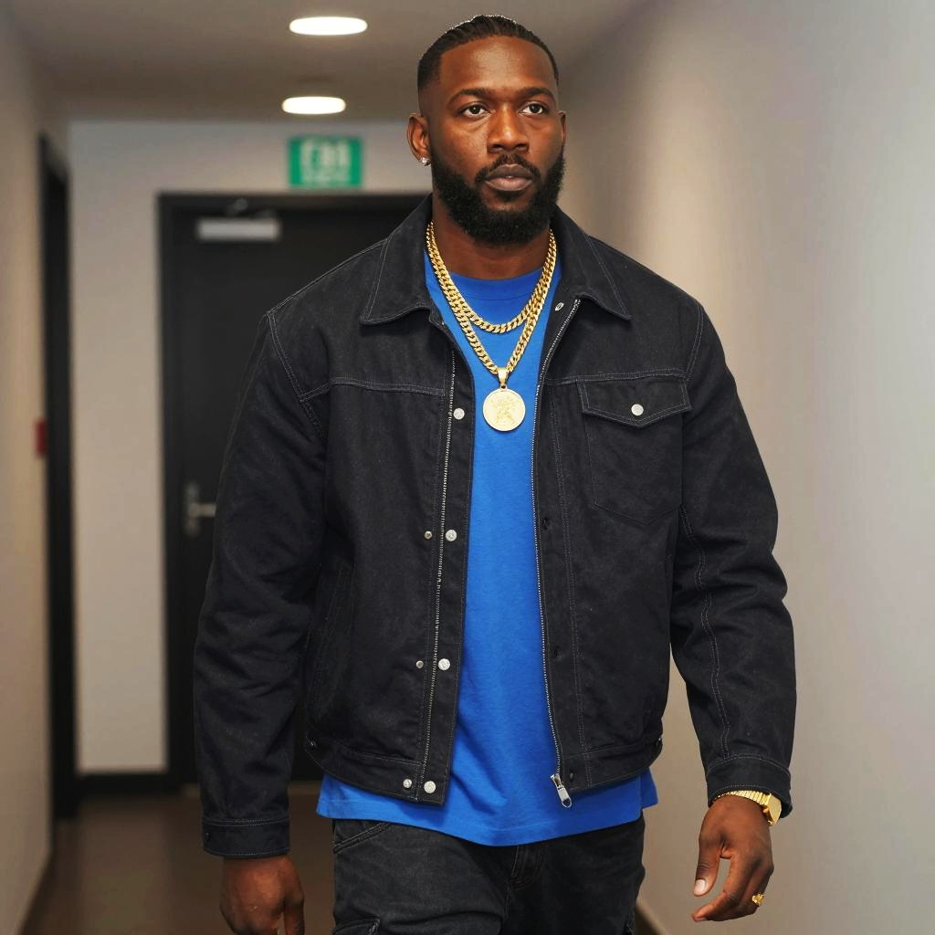 Confident young Black man with neatly groomed beard and mustache walking down a hallway. He is wearing a dark denim jacket with prominent stitching over a blue shirt, paired with dark pants. He accessorizes with multiple gold chains including a large medallion, gold wristwatch, ring, and earring, portraying a bold urban fashion style.