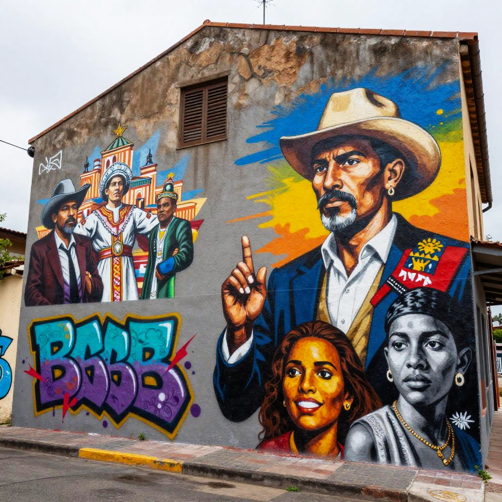 Costumbres visualized as street art murals depicting historical customs, vibrant graffiti style blending modern and traditional elements, colorful murals on urban walls with cultural symbols, dynamic composition, reflections of heritage and identity through contemporary urban creativity.