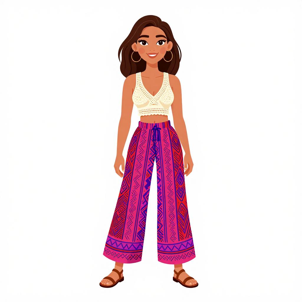 Woman with pretty face and pretty hair. smiling Woman, bohemian, lightweight halterneck dress in a purple and white paisley pattern, deep V-neckline, gathered at the waist, knee-length with an asymmetrical hem, thin spaghetti straps tie at the back of the neck, casual sandals, white background. --sref 1467