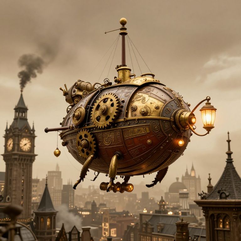 Steampunk airship with gears, lantern, and teapot floats over Victorian London skyline, smokestacks, and clock towers under a cloudy sky