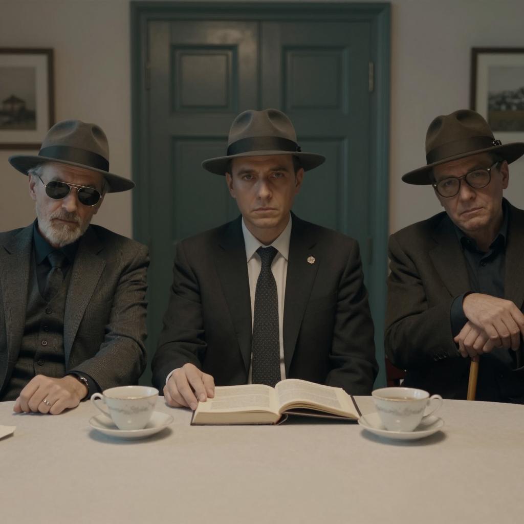 Three men seated at a table, wearing dark suits and hats, in a dimly lit room. Middle man in center, serious expression, dark suit, white shirt, patterned tie, flower pin, left hand on book. Left man with grey hair, sunglasses, grey plaid suit, right hand on table. Right man with glasses, brown hat, brown jacket, leaning on cane. Two white tea cups with saucers on table. Green door in background.