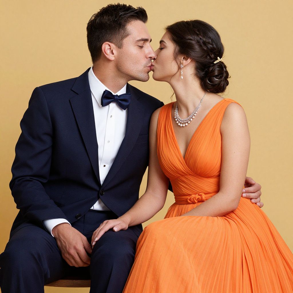 Elegantly dressed couple sharing an intimate kiss, with the man in a navy blue tuxedo and bow tie seated beside the woman in a vibrant orange gown, both adorned with jewelry, set against a warm yellow background.