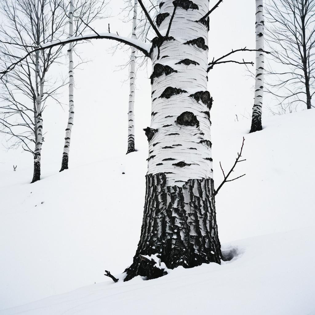 Sparse birch trees with distinct white bark and black markings, standing in a snowy forest landscape. The ground is fully covered with snow, creating deep voids around the tree trunks where lower branches prevent snow accumulation. The scene highlights the contrast between the dark tree trunks and the bright snow in a cold winter environment.