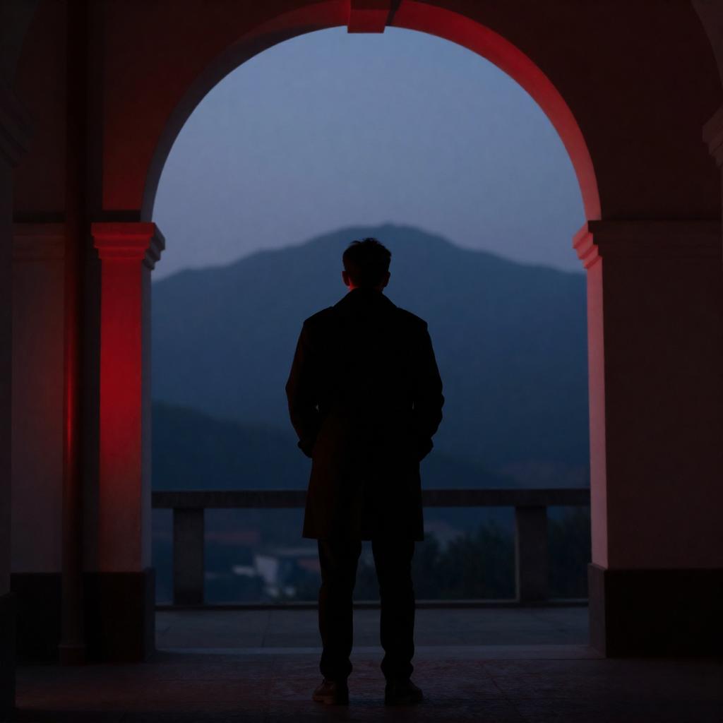 Silhouetted man in dark overcoat stands under red-lit archway at dusk. Mountains in background. Red light on pole to left. Dark sky, faint blue hue. Man's back to camera, head slightly bowed. One person, shadowy, no intense expressions.