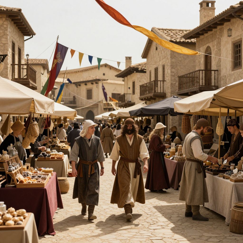 Photograph of a bustling medieval-style market square. People in period clothing, including tunics, vests, and hats, walk and browse under white canvas canopies. The square is lined with stone buildings featuring wooden balconies and tiled roofs. Colorful flags hang overhead. Vendors display an array of goods, including baskets, pottery, and food items, on tables covered with red and white cloths. The scene is sunlit, casting shadows on the cobblestone ground. The overall atmosphere is vibrant and historical, evoking a sense of medieval commerce.