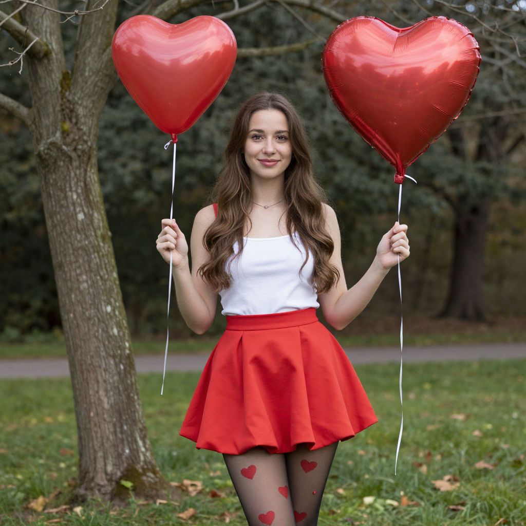 Photograph of a young Caucasian woman with long, wavy brown hair standing in a grassy park. She wears a white sleeveless top, a bright red A-line skirt, and black tights with red heart patterns. She holds two shiny red heart-shaped balloons on white strings, one in each hand. The background features a tall tree trunk on the left and dense, dark green foliage. The woman has fair skin and a slight smile, and the overall scene exudes a cheerful, romantic vibe. The ground is covered in green grass with scattered fallen leaves.