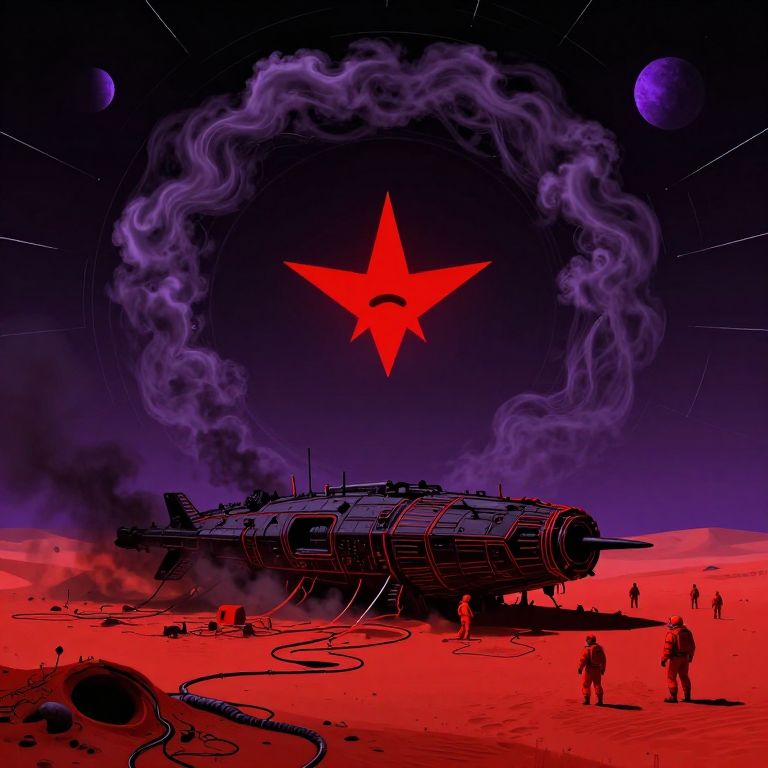 Digital illustration of a massive, smoking rocket under a red star with purple smoke, set against a red desert sky with two purple planets. Small figures stand