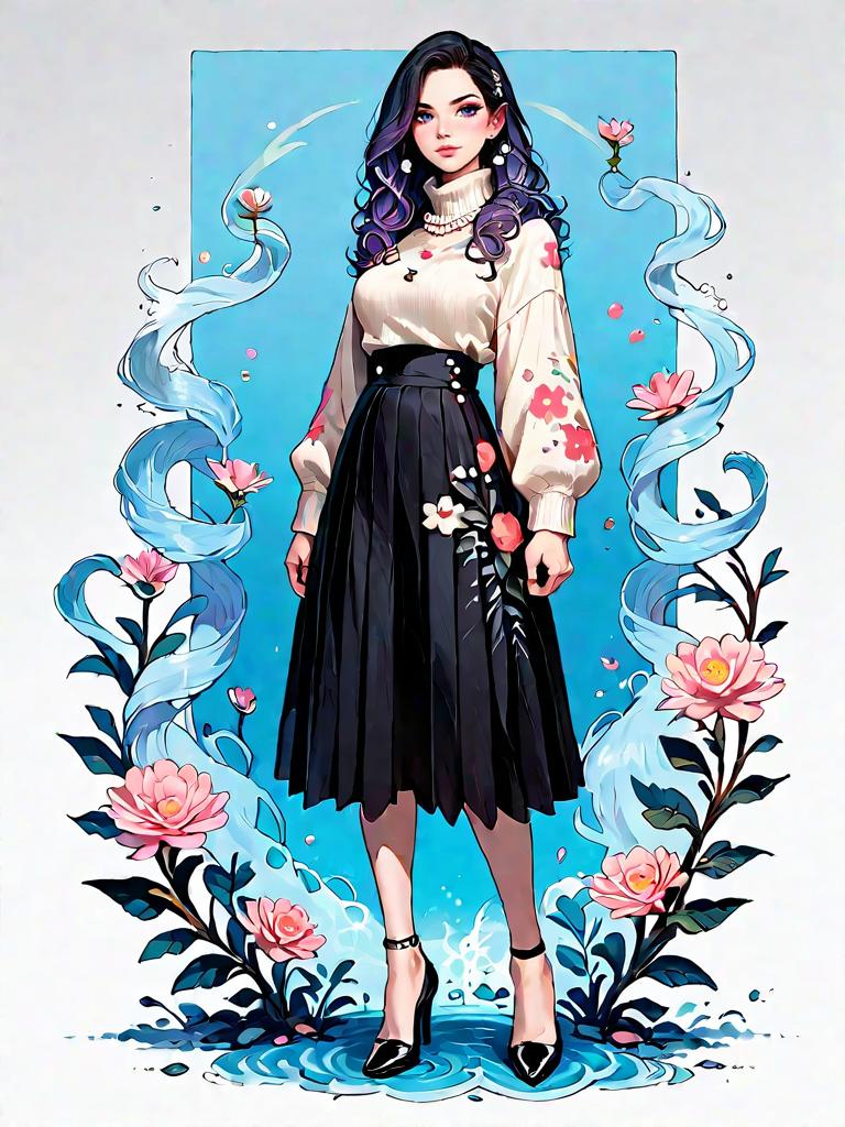 1girl, source_comics, realistic face, full body shot, Woman, contemporary with a vintage twist, polka-dot dress in black with white dots, purple floral print accents, sweetheart neckline, short puff sleeves, mid-calf length with a flowing asymmetrical hem, white low-top sneakers, minimal jewelry, studio background with a plain and bright setting.