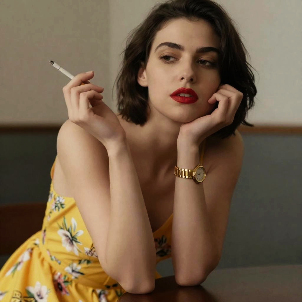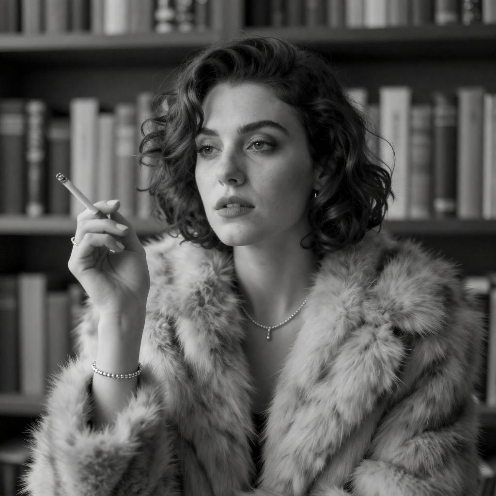 Black-and-white photograph of a woman with wavy, shoulder-length hair wearing a silky, satin nightgown, holding a cigarette holder. She stands beside a table with a lamp, mirror, and folded fan. Her reflection is visible in the mirror. She has a slightly intense expression. The table has a ruffled, lace tablecloth. The background includes a louvered door.