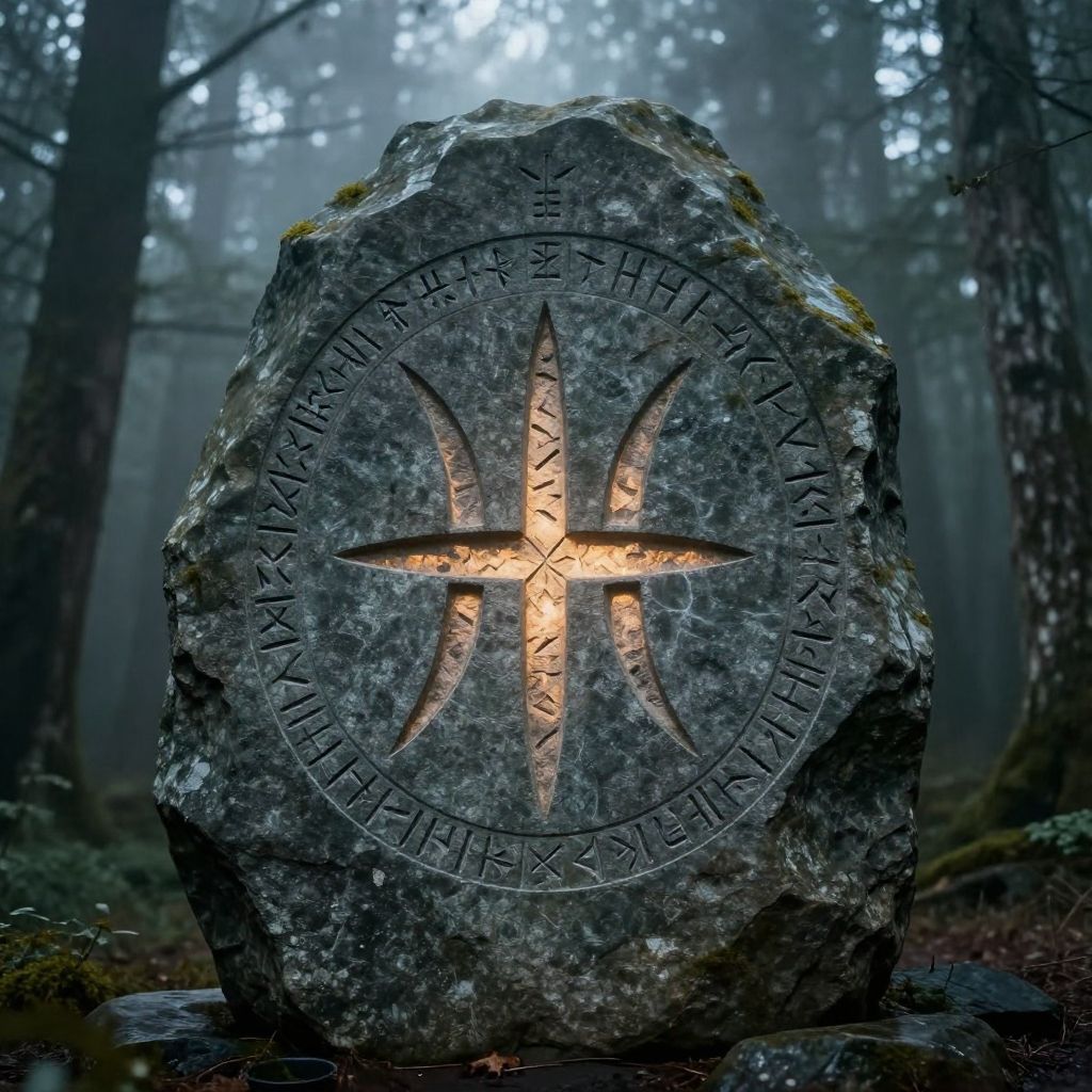 Heimdall logo engraved on ancient stone, surrounded by Nordic runes, misty forest background, glowing subtle light, mystical atmosphere, detailed textures, atmospheric and powerful