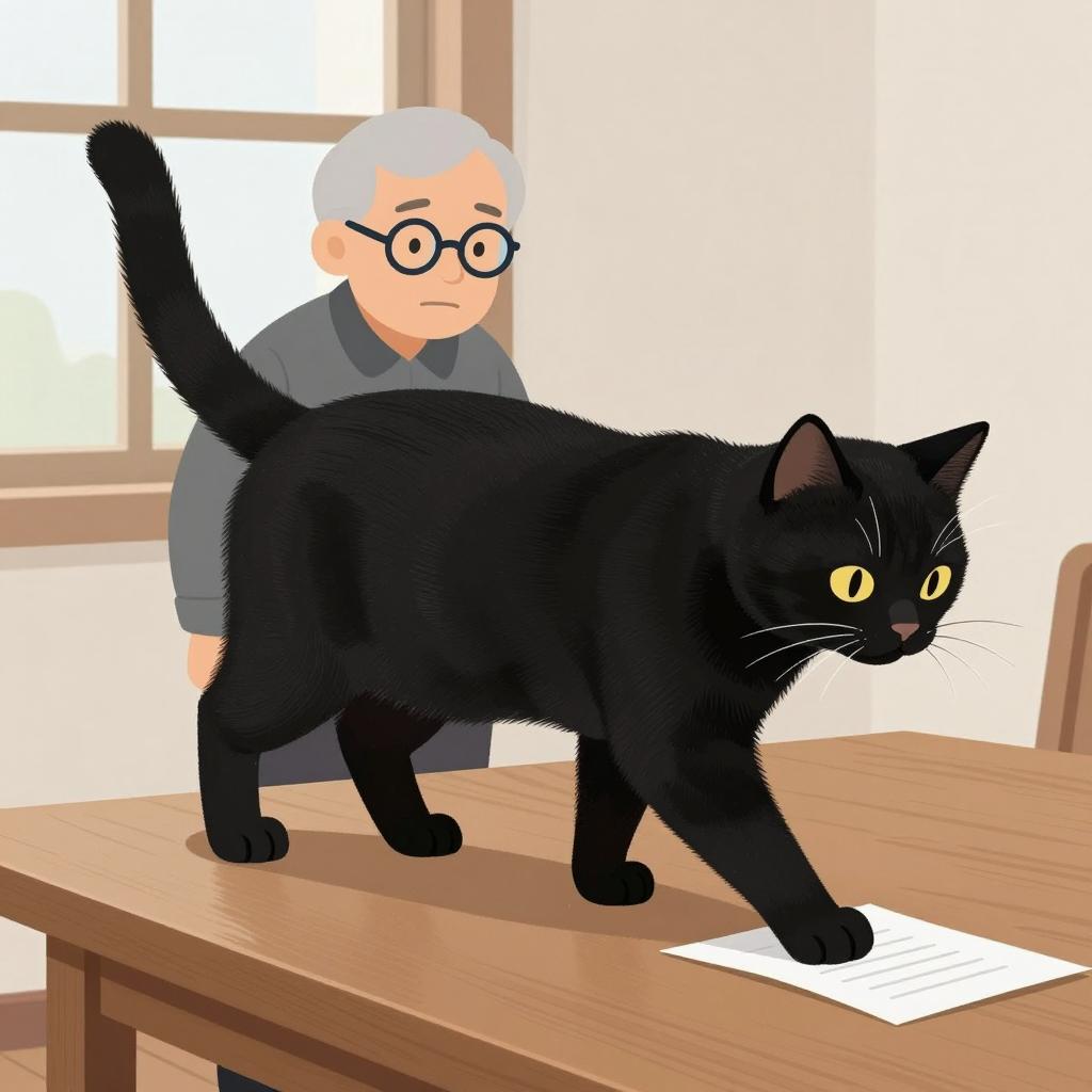 Illustration of a black cat with a shiny, ured coat walking on a wooden table, stepping on a white piece of paper. An older man with gray hair, glasses, and a neutral expression stands behind the cat, partially obscured by a window with wooden frames. The cat's head is lowered, focusing on the paper. The background is a plain, light-colored wall with the window and wooden floor.