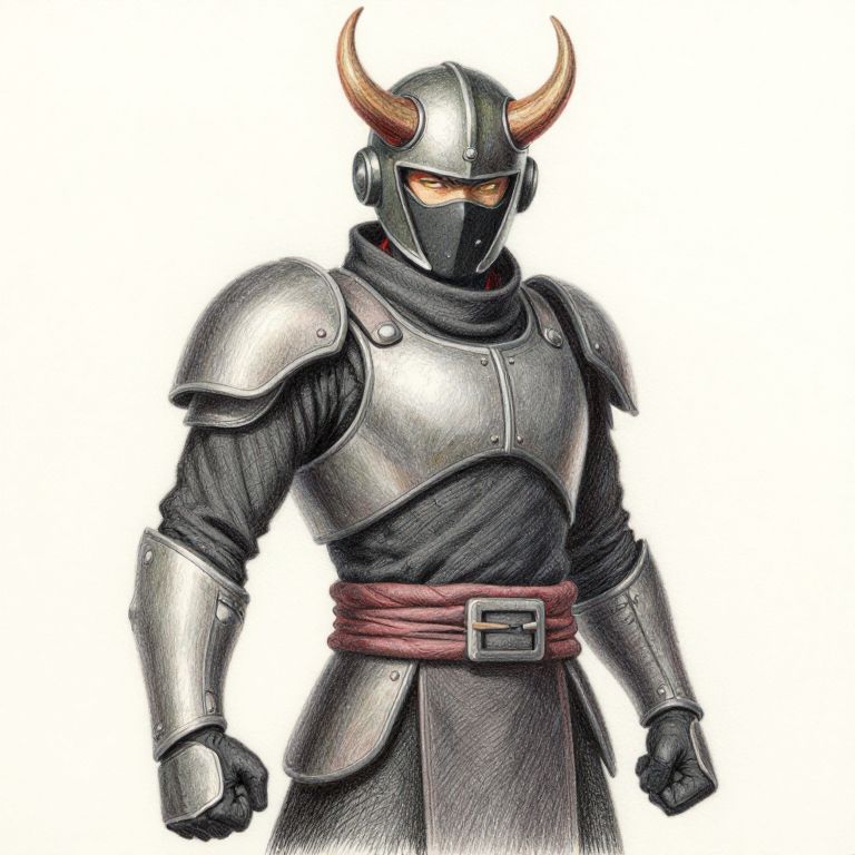 Digital drawing of a knight in silver armor with orange eyes, black mask, and red sash, featuring prominent horns.