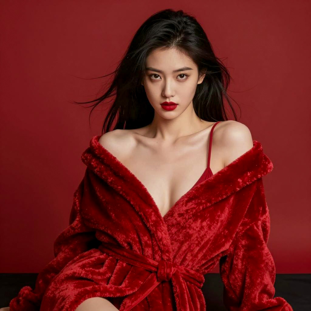 Portrait of an Asian woman with dark hair styled in an updo, wearing a black strappy dress with an exposed right shoulder. She looks back with an intense expression. Two Asian men with serious expressions stand blurred in the dark background on either side, both dressed in black jackets and shirts. The lighting highlights the woman's face and shoulders, creating a dramatic contrast with the shadowed men.