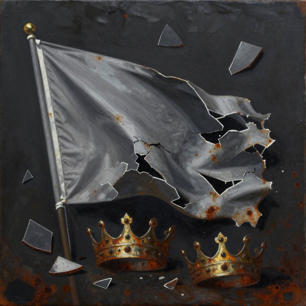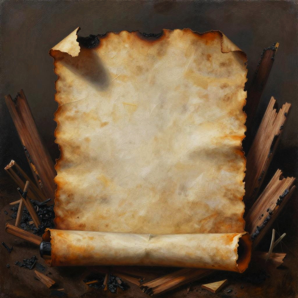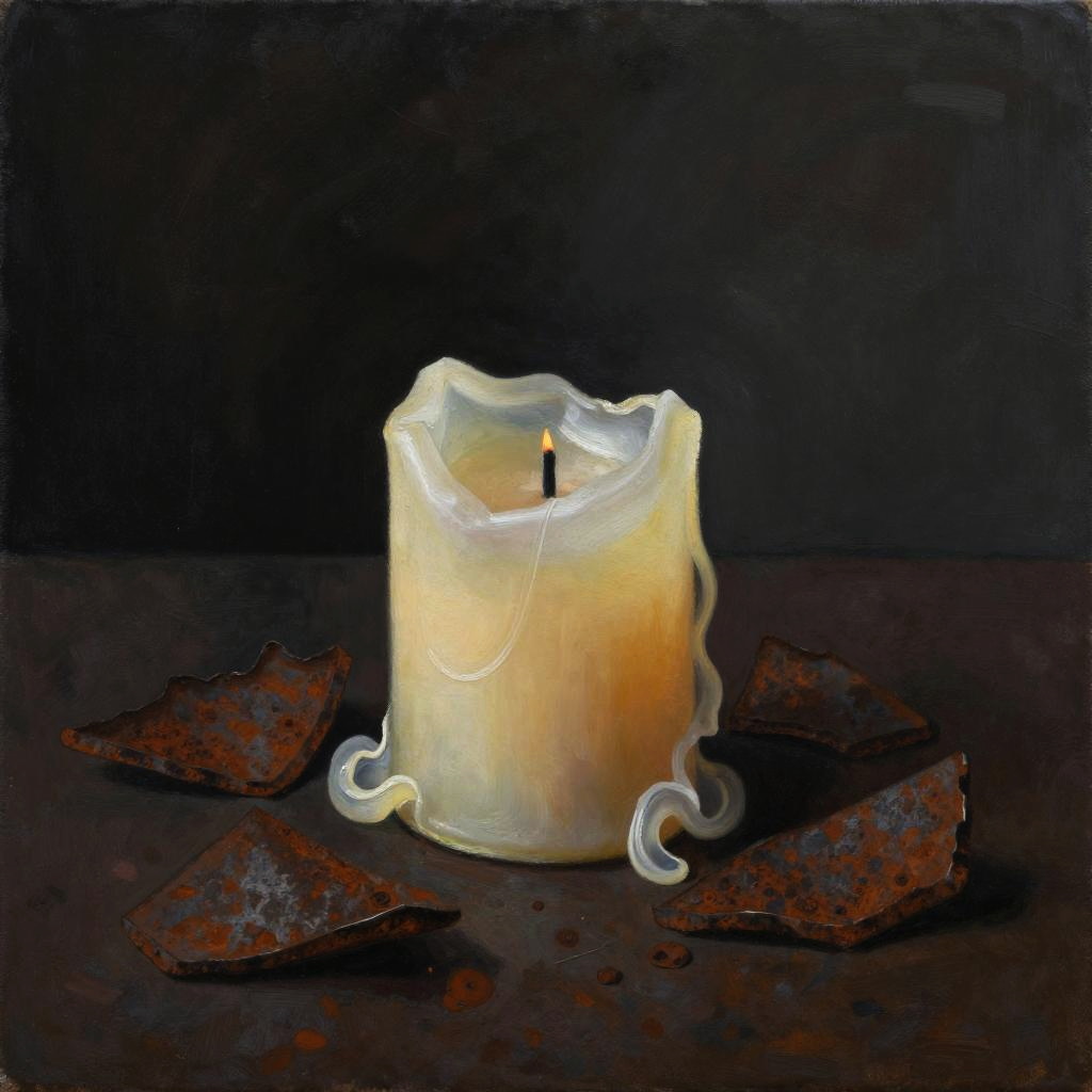 Symbolic painting of a cracked porcelain doll surrounded by decaying Victorian wallpaper, in the style of Anselm Kiefer, emphasizing muted pinks and cold creams.