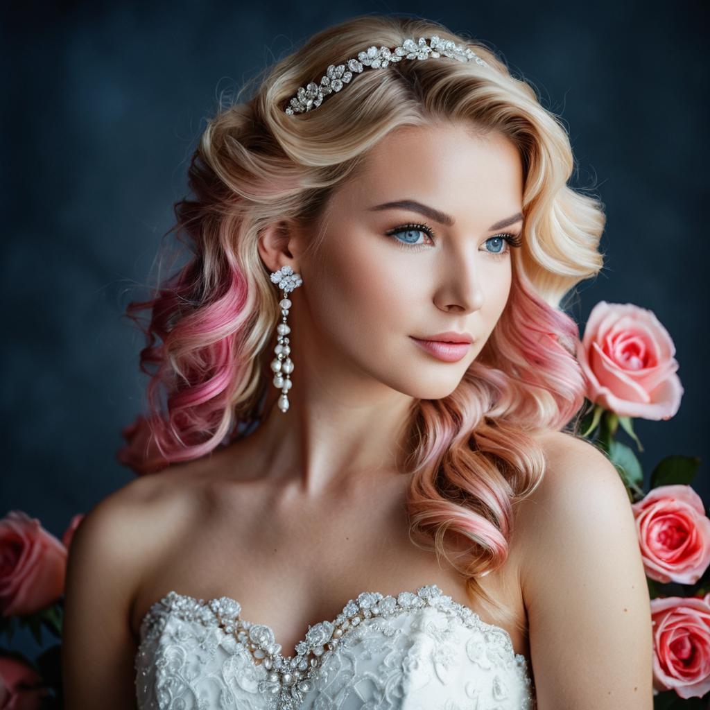 Rose hairstyle wedding, digital art, portrait, beautiful young woman, long wavy blonde hair with pink highlights, blue eyes, fair skin, wearing white strapless dress with lace detail, elegant pearl and diamond drop earrings, background filled with pink and red roses, soft light, realistic style, slight fantasy vibe, romantic and feminine atmosphere, high detail in hair and flowers, front view, looking slightly to the side, soft expression, photographer's studio lighting, medium close-up