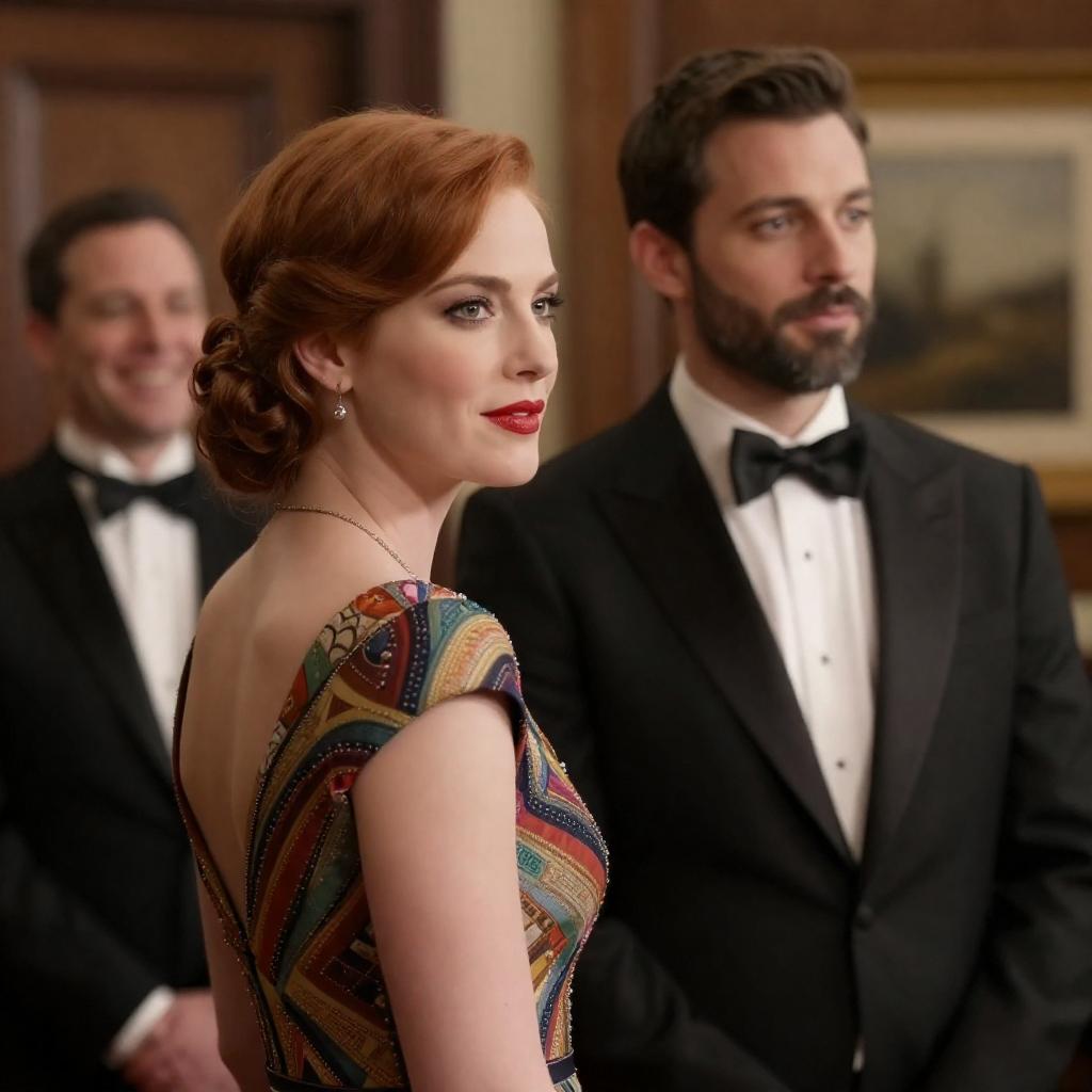 Woman with red hair in a glittery, sequined dress stands confidently with hands on hips, head tilted back. Elegant, ornate room with blue columns and gold accents. Crowd of people, some smiling, others looking at her. Background includes large windows. Woman's dress has intricate patterns, contrasting with the elegant, classical architecture. Multiple people in formal attire. Woman's intense, upward gaze.