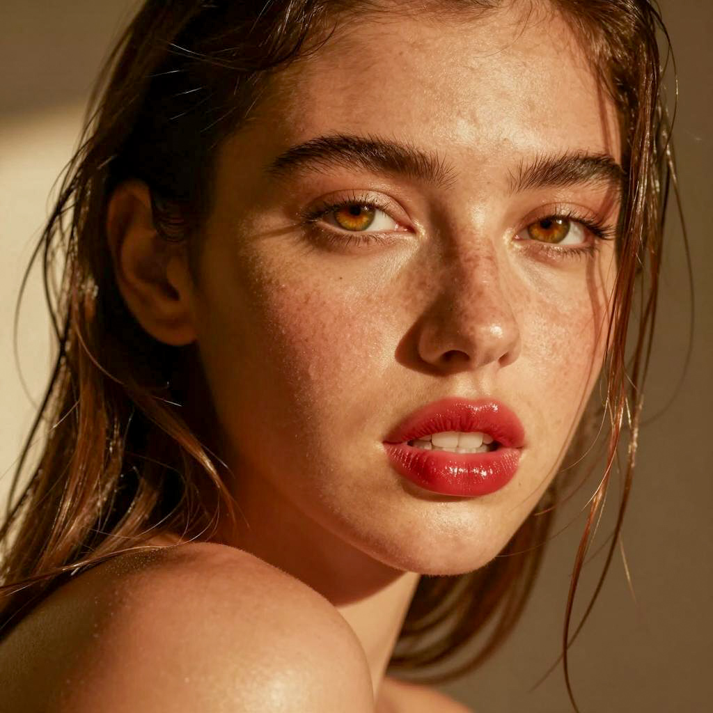Close-up photograph of a woman with fair skin, green eyes, and full pink lips. Wet brown hair falls across her face, partially covering her eyes. Dark, smoky eye makeup. Neutral background. She gazes directly at the camera with a neutral expression. Watermarked in the bottom left corner.