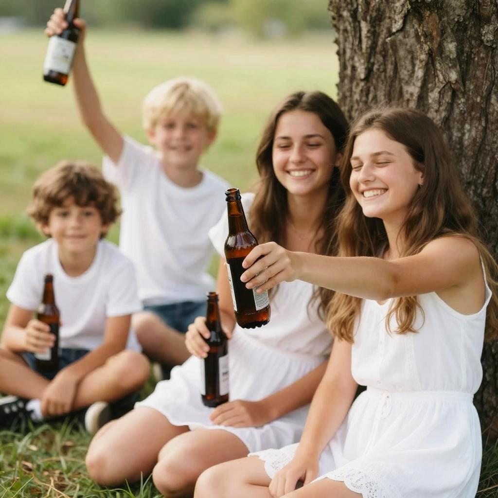 Multiple boys, multiple girls, smile, blonde hair, 2girls, outdoors, brown hair, bottle, shirt, blurry, dress, long hair, grass, tree, grin, sitting, 2boys, realistic, white dress, pointing, sunglasses, closed eyes, day, holding, depth of field
