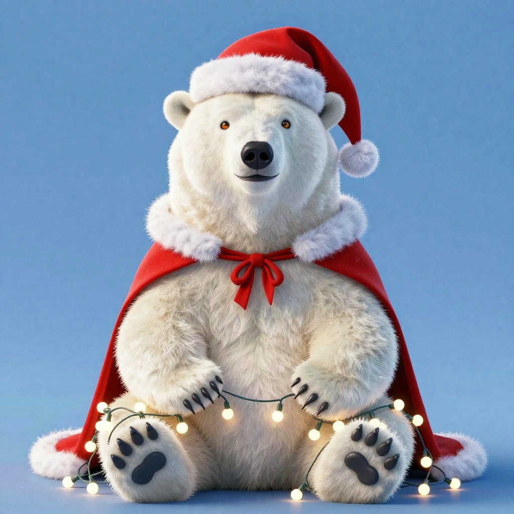 Full body, solo, animal, bear, polar bear, sitting, santa hat, red cape, fur trim, fur-trimmed headwear, festive polar bear with subtle snowflake-shaped markings across glossy white fur, a playful smirk and bright amber eyes, sitting upright, gently holding a string of twinkling fairy lights draped around its paws, blue background