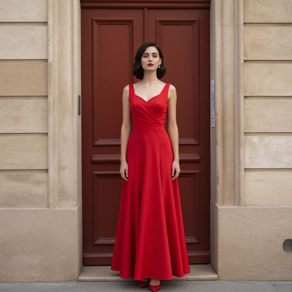 Red Moulin Rouge Dress, woman in red dress standing in front of a door
