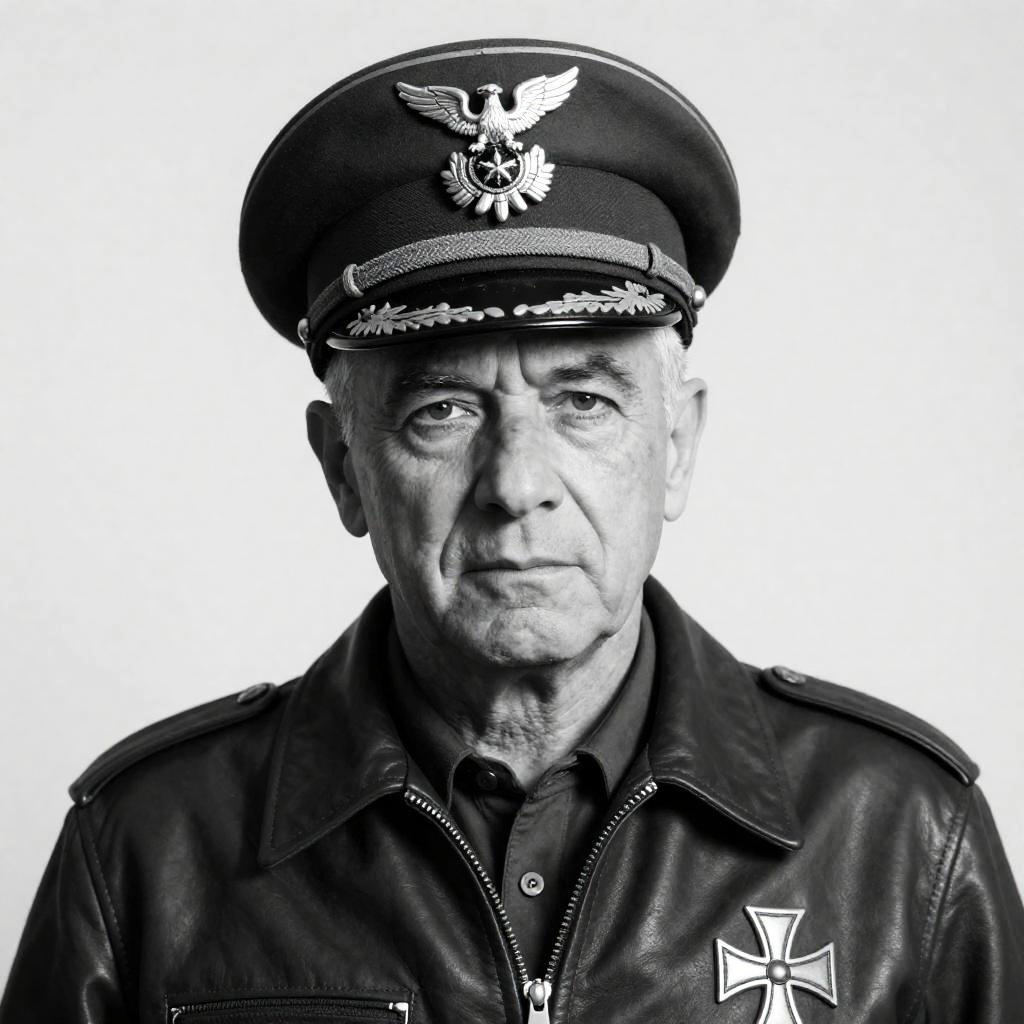 Elderly military officer in olive green uniform and cap, with star insignia, leaning out of vintage green car door. Background: urban street with white buildings, people walking. Officer's expression: serious. Car interior: wooden dashboard, gauges. Officer's right hand on car door, left hand on handle.