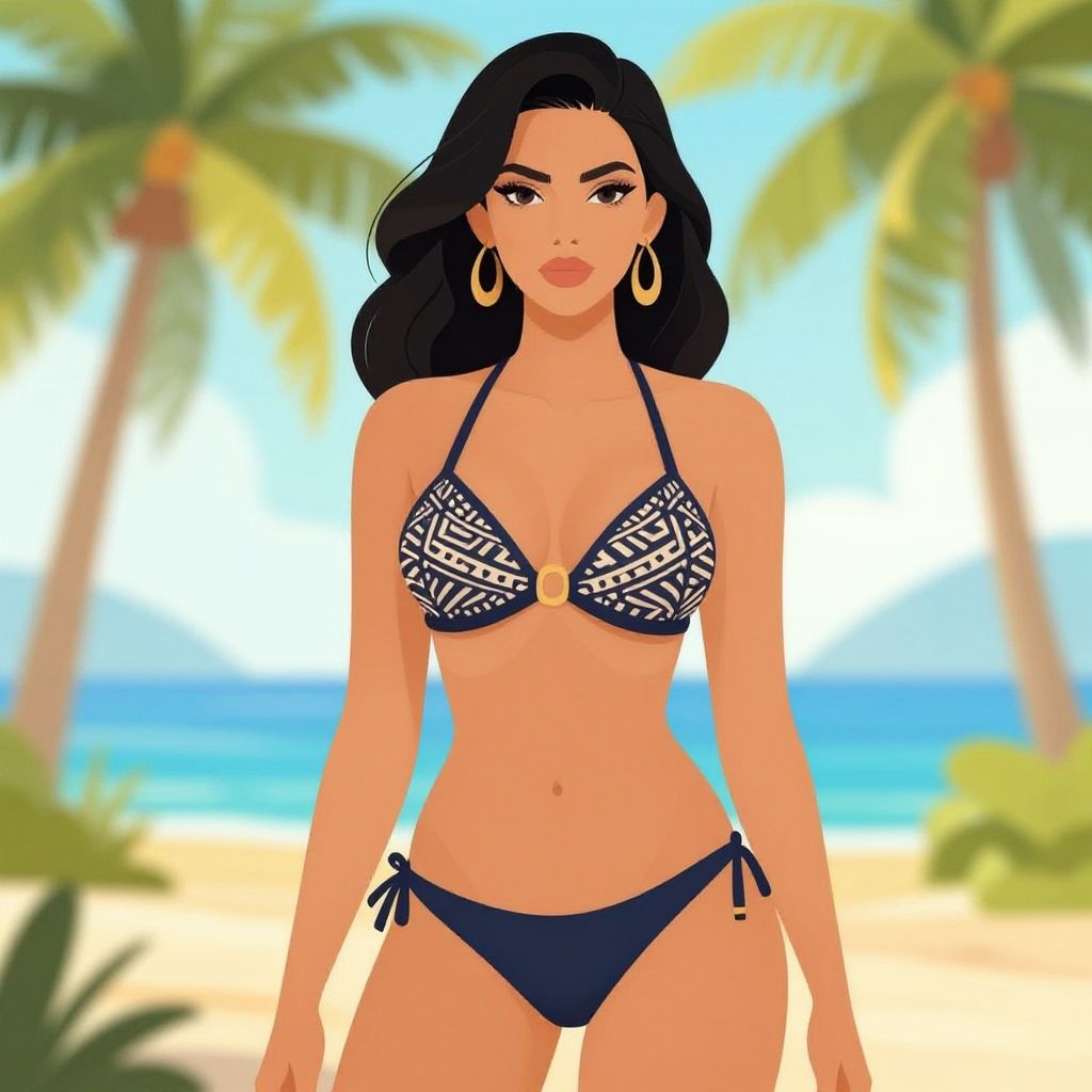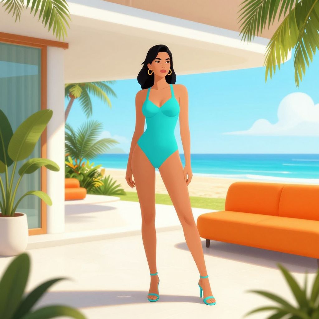 A stylish woman in a turquoise swimsuit and matching heels stands confidently in a modern, open-air beach house with tropical plants and an orange couch. The bright, vibrant colors and clean lines showcase a digital art style inspired by retro-futurism and contemporary illustration. The serene ocean and clear sky form a stunning backdrop, blending luxury and tropical relaxation.