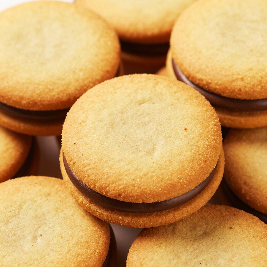 Close-up view of round, golden-brown sandwich cookies with a smooth, dark chocolate filling. The cookies feature a slightly crumbly texture with visible specks and a light brown surface, arranged closely together with no background visible.